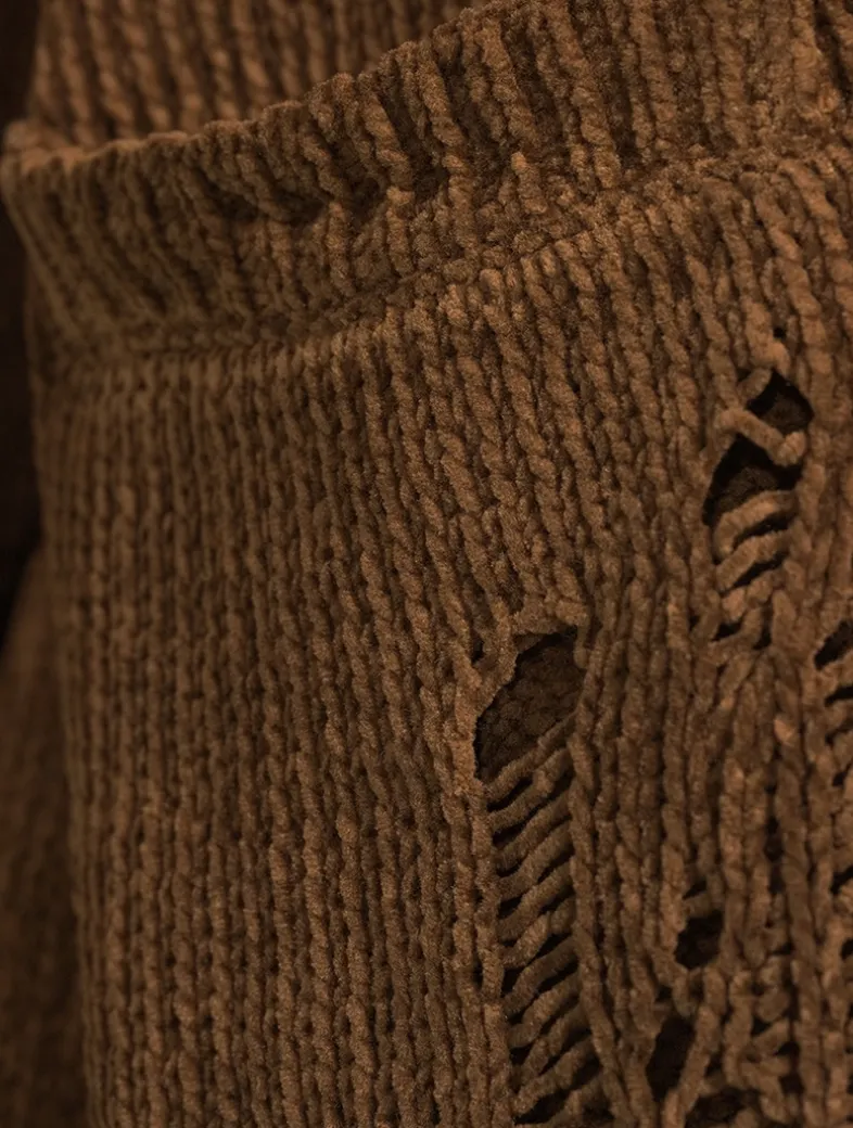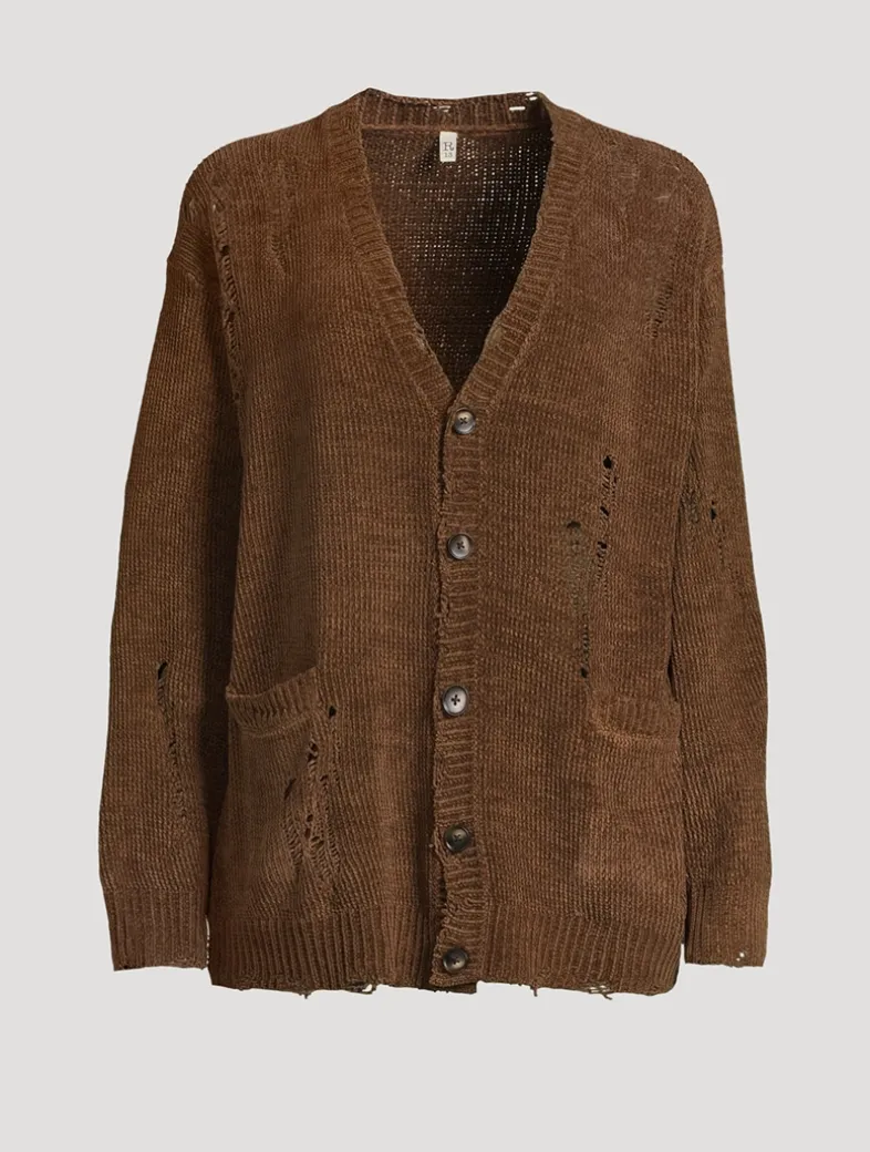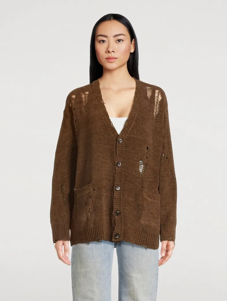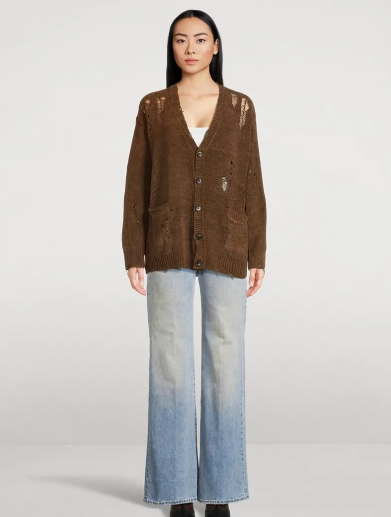 Crafted from cotton with a soft chenille finish, this button-front sweater is cut to a slouchy silhouette with distressed detailing.