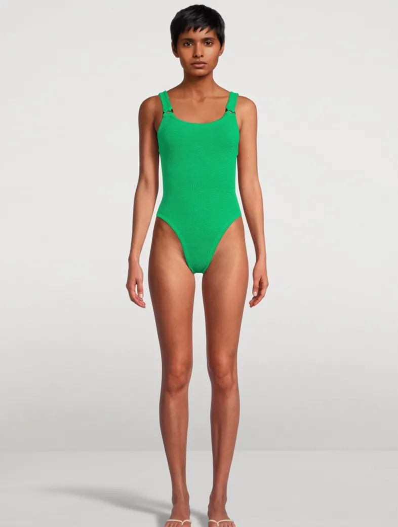 A nod to Hunza G’s roots in the ’80s, this high-cut leggy design features tortoiseshell accents, a dipped-neck silhouette, and low scooped back. Offering light bust support and classic coverage on the bottom, the one-size fit is made possible by the brand’s signature figure-flattering crinkle fabric that flexes to sculpt and support most shapes. Certified to the OEKO-TEX® Standard 100, LEATHER STANDARD, or OEKO-TEX® MADE IN GREEN.