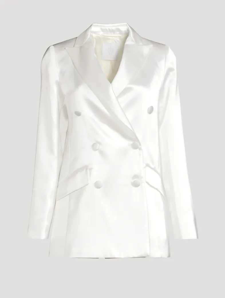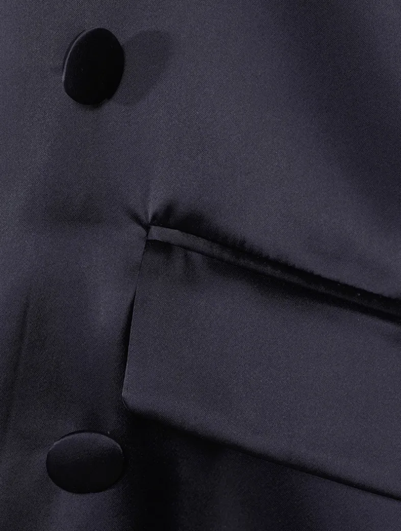 Made in Italy, this elegant blazer is crafted from satin with a glossy finish. It is designed with a double-breasted button closure and flap pockets at the waist.