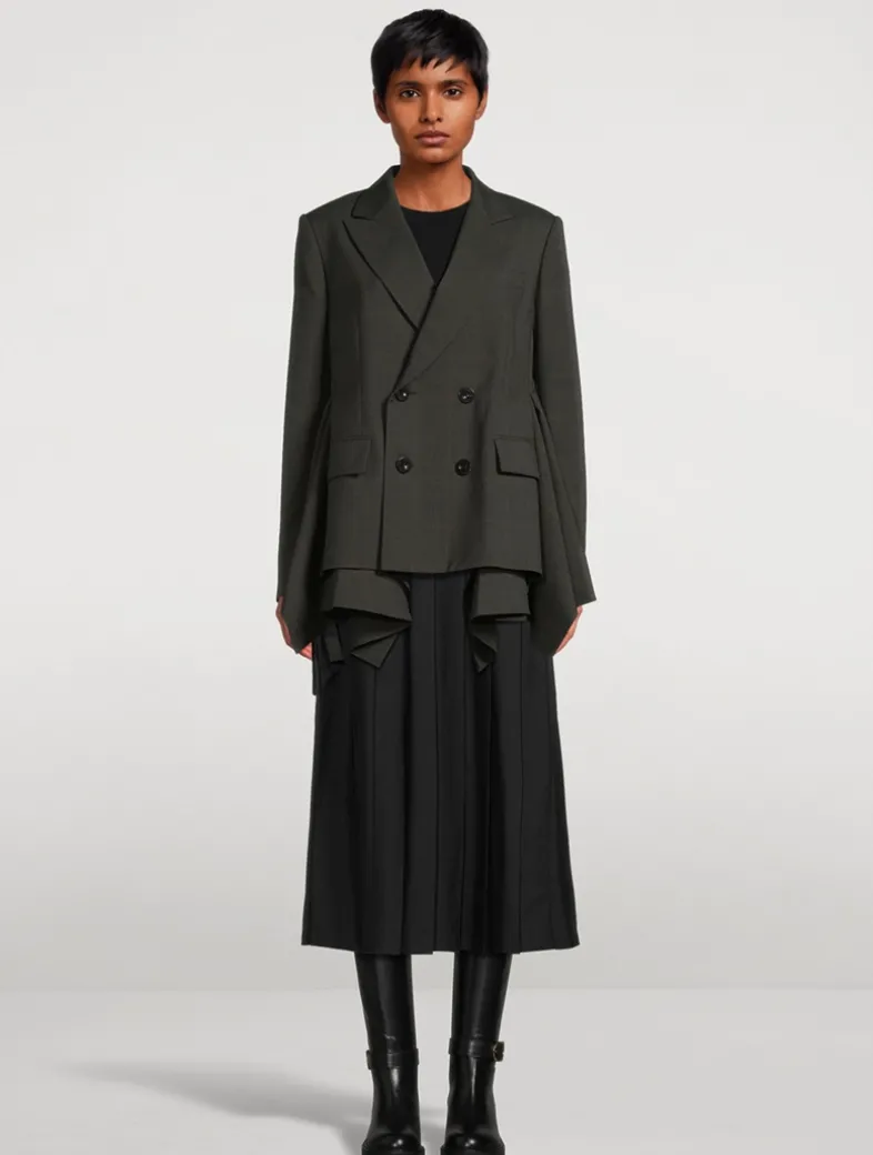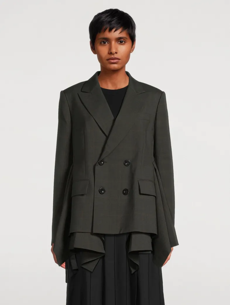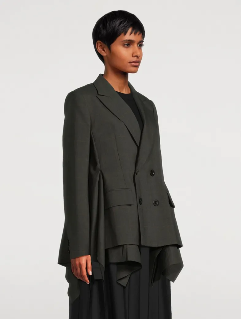 Crafted from wool, this blazer mixes classic styling with unexpected detailing. It has an oversized, double-breasted silhouette with handkerchief-style accents peeking from the hem.