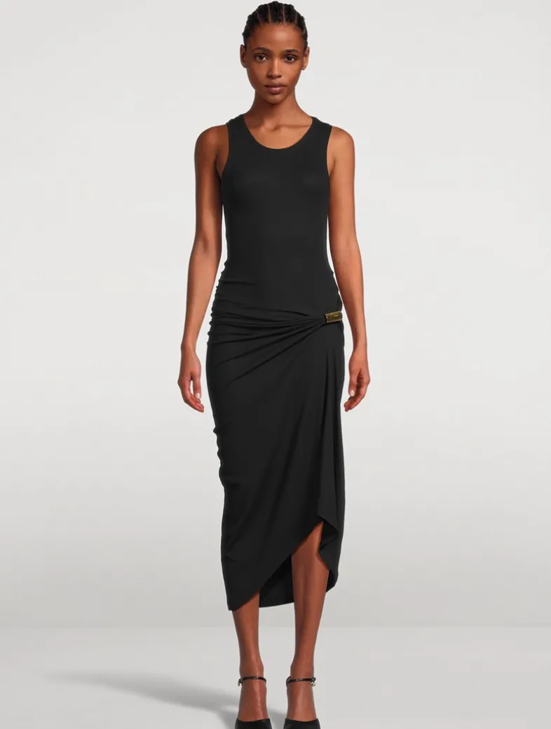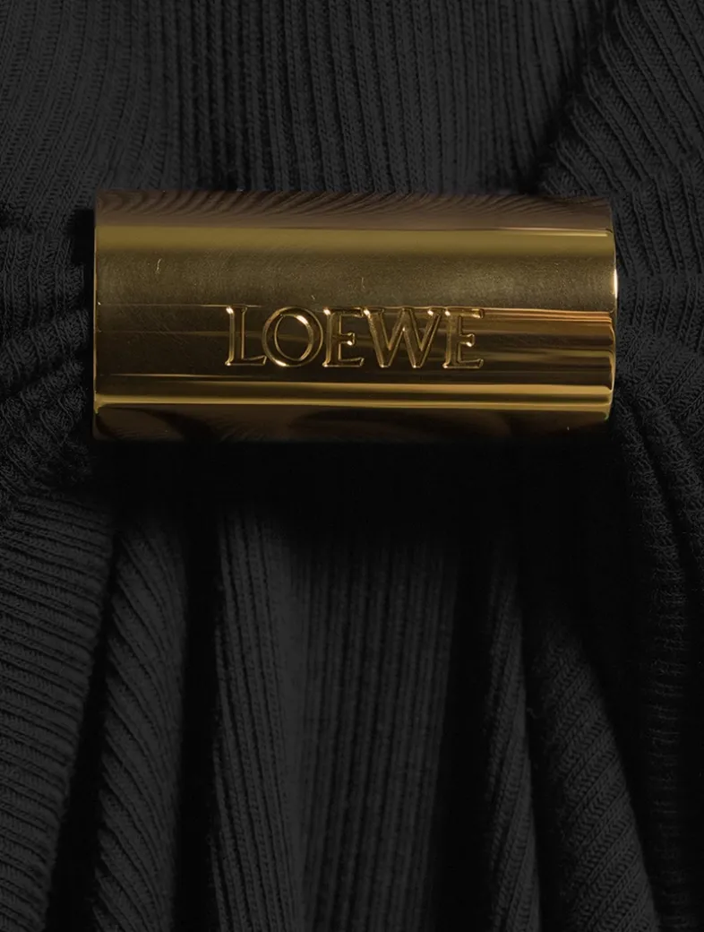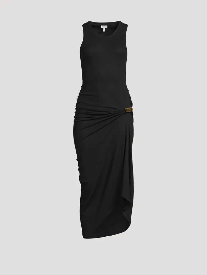 Made in Portugal, this sleeveless dress is crafted in lightweight stretch ribbed cotton featuring asymmetric draping with a detachable LOEWE-engraved metal embellishment.