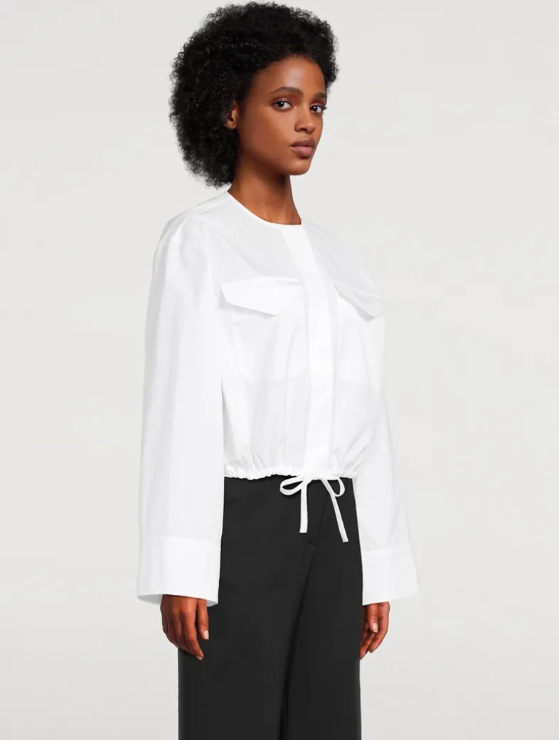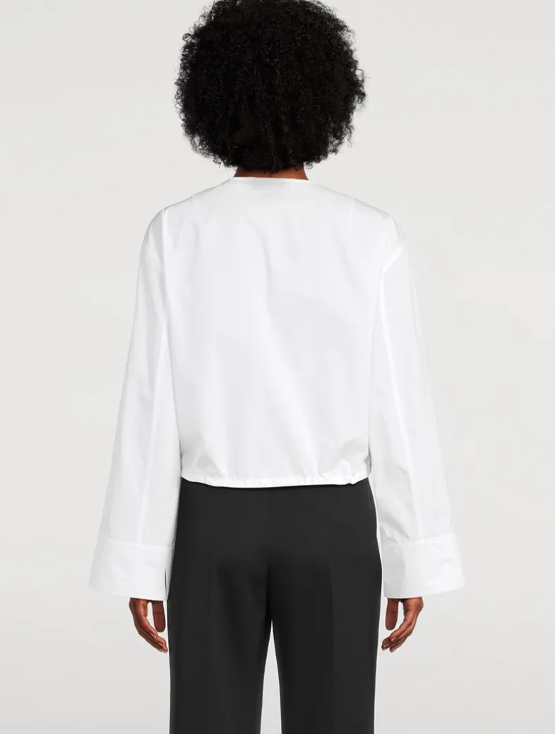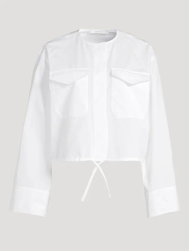 This long-sleeve shirt is crafted from a crisp cotton poplin adorned with a logo-printed grosgrain ribbon on the chest. Finished with flap pockets and a concealed closure, it has a cropped silhouette with a drawstring hem.