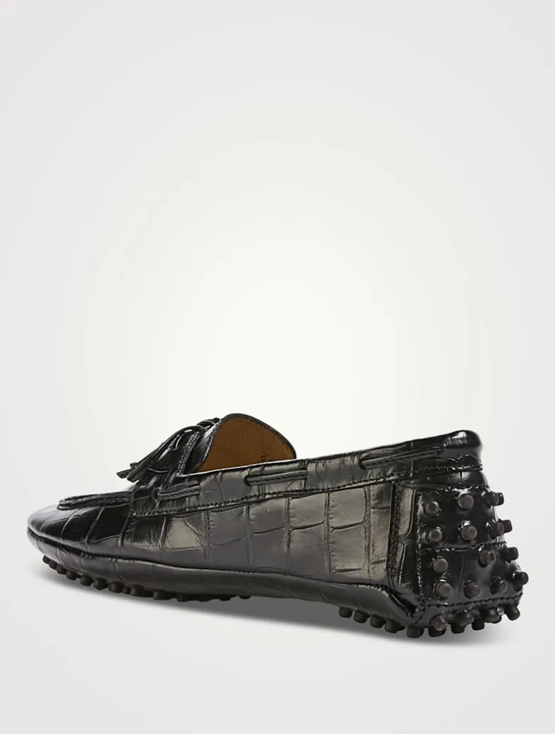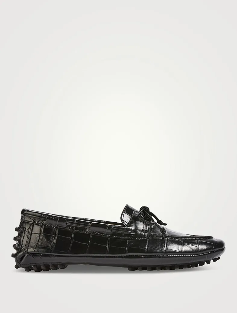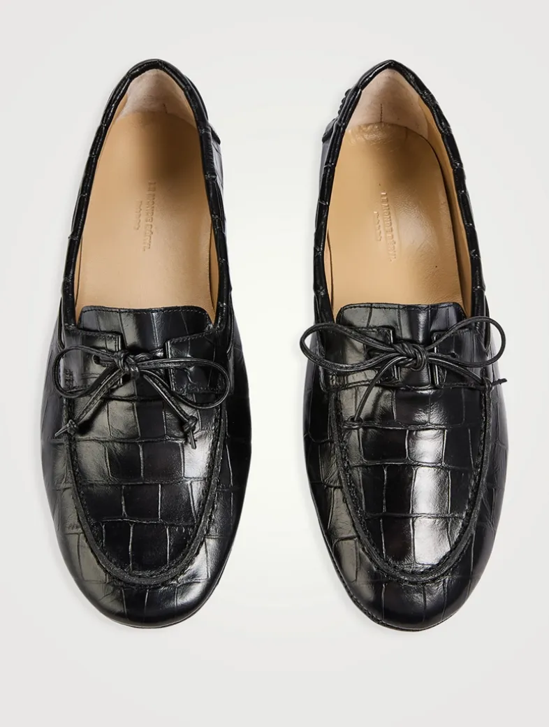 These round-toe flats are crafted in embossed calf leather with a cushioned leather insole and rubber pebble sole. Made in Italy.