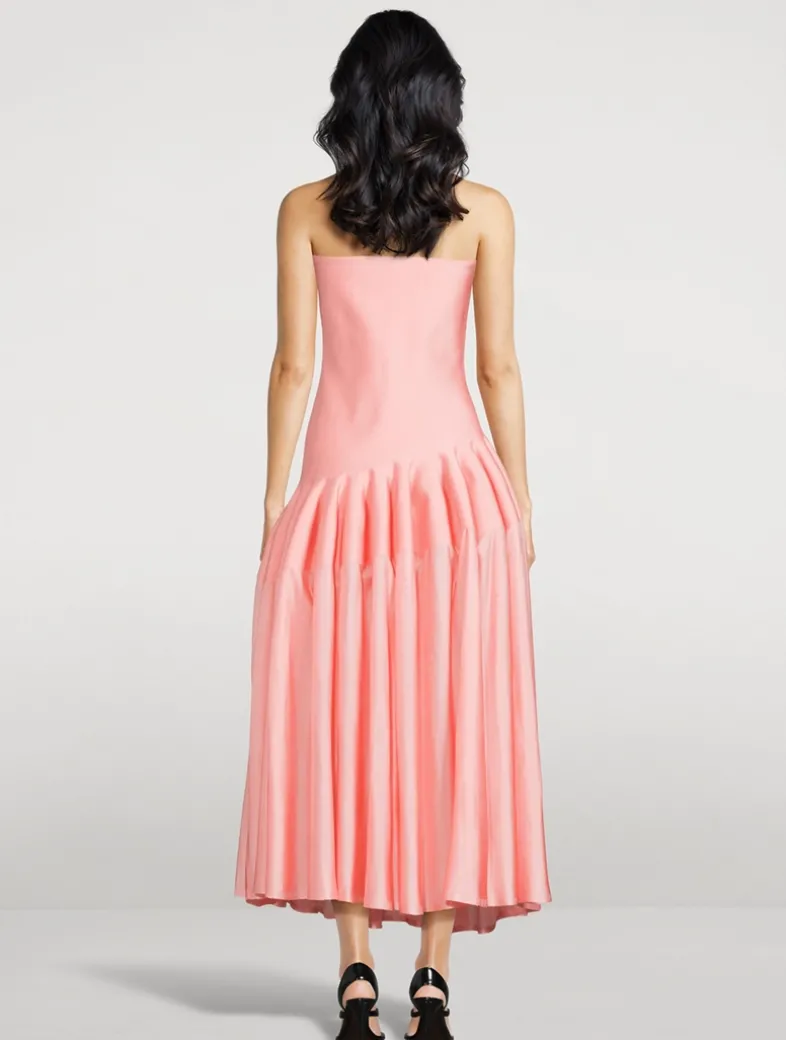 This striking dress has a sculptural design. It has a strapless squareneck bodice that falls to an asymmetric dropped waist. Godets at the skirt create fluttering volume.