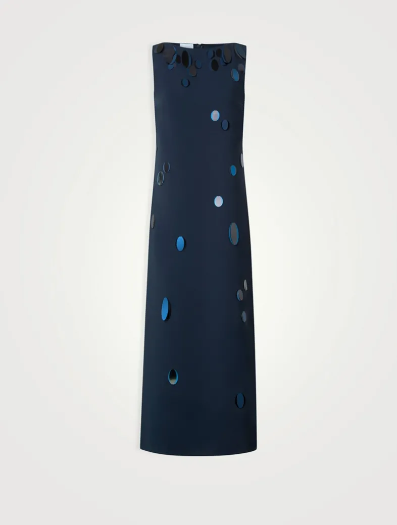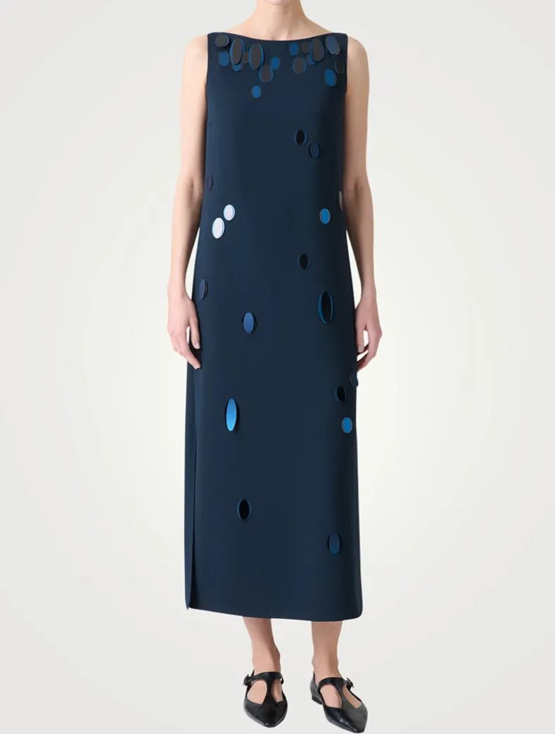Akris Punto’s Dropping Dots embellishment adorns this sleeveless dress, lending a hint of sparkle and texture to the piece. It is crafted of a heavy laser cut crêpe, designed with a bateau neckline and calf-length hem with side slits.