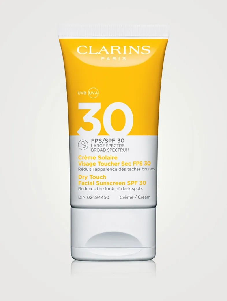 A broad spectrum protection SPF 30 sunscreen for the face. With 40 years of sun care expertise, Clarins’ research goes further in skin protection with two proprietary Sun Complexes that preserve your skin’s youth and beauty with unrivaled results: New [SUNFILTERCOMPLEX] helps lock out harmful UVA/UVB rays that result in sun spots and wrinkles. Antioxidant-rich [ENRICHED WITH PLANT EXTRACTS] combination is infused with free radical-fighting Plane Tree, Senna, Baobab, Olive Tree and Pea extracts to help protect skin from photoaging. Moisture-rich Aloe Vera extract soothes, softens and hydrates skin while you sun. The ultra-sensorial, velvety, dry touch cream melts into the skin with a clear matte finish while its aromatic formula—including an exotic blend of Tangerine, Orange, Blackcurrant, Peony and Sandalwood—is sure to brighten your day.