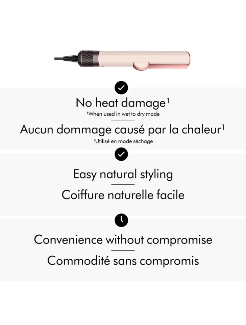 The Dyson Airstrait™ straightener uses high-pressure airflow to straighten hair as it dries. Air is precisely heated and projected evenly through the tress as you style – with no hot plates, no heat damage (when used in wet to dry mode). Straightens from wet to dry, simplifying your routine. For a natural straight finish.