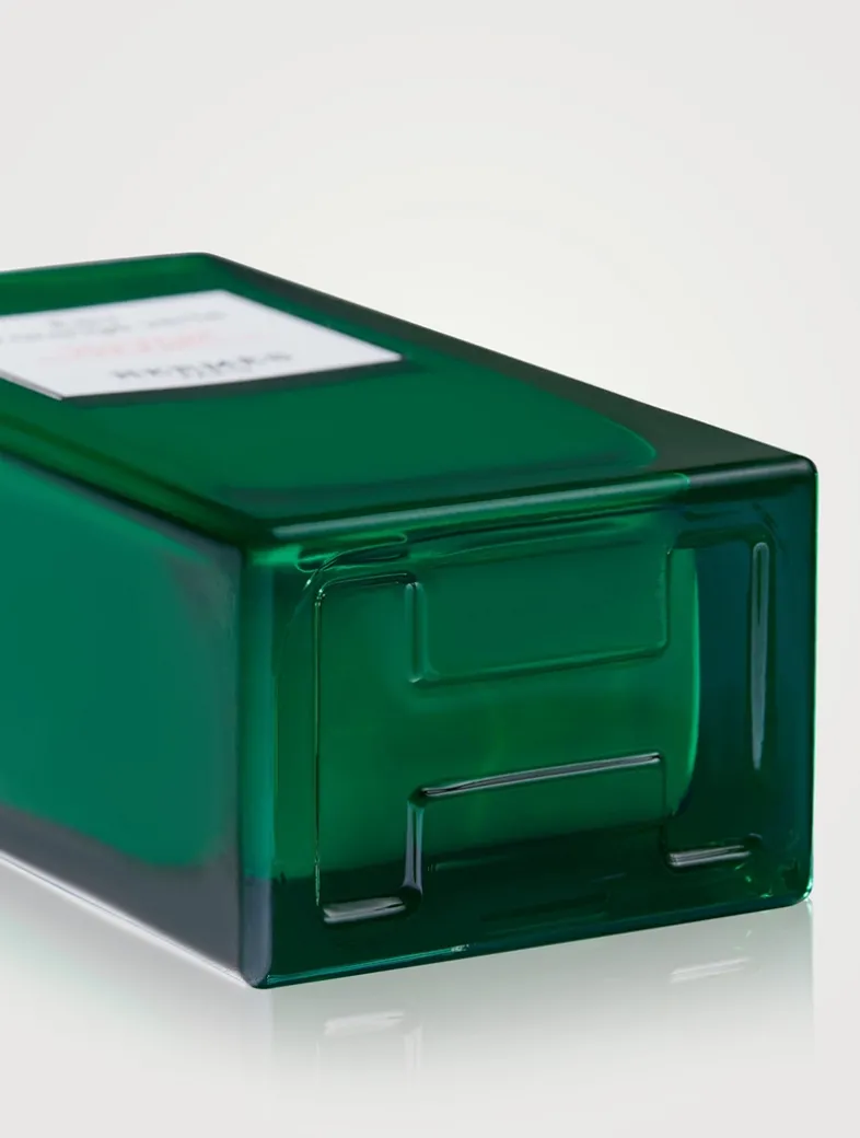 The Object: The straight lines of the bottle are embellished with a deep green, emblematic of Eau d’orange verte, and two signature details: the H imprint of the base and the Clou de Selle engraved on the pump.