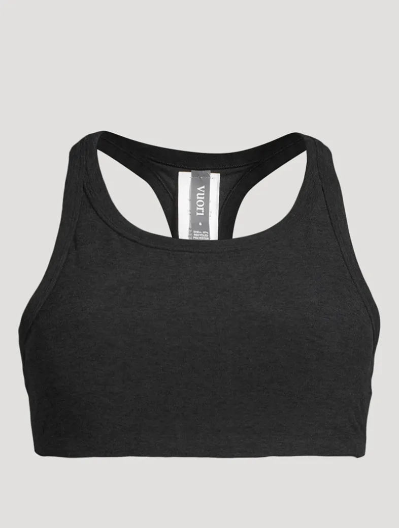 The Elevation Racer Bra features a scoop neckline, thick elasticized straps, and built-in bra with removable cups for medium support. Made with a soft performance stretch knit from 87% recycled materials, this sports bra wicks away sweat and keeps you feeling fresh through every workout.