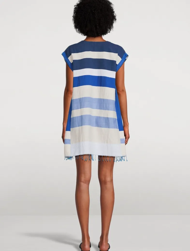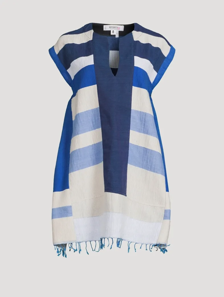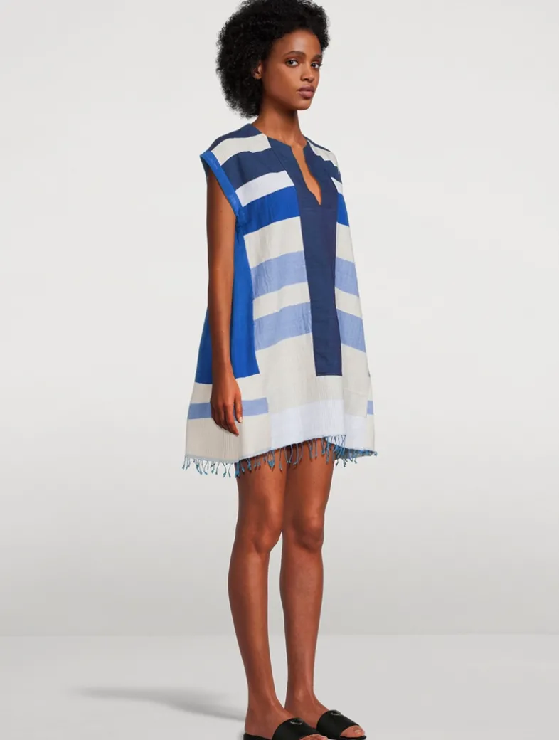 Handspun and woven by artisans in Ethiopia, this cotton caftan shows a lot of leg, while keeping the cut generous and breezy. The eye-catching stripe pattern is offset by a hand-twisted fringe at the hem.
