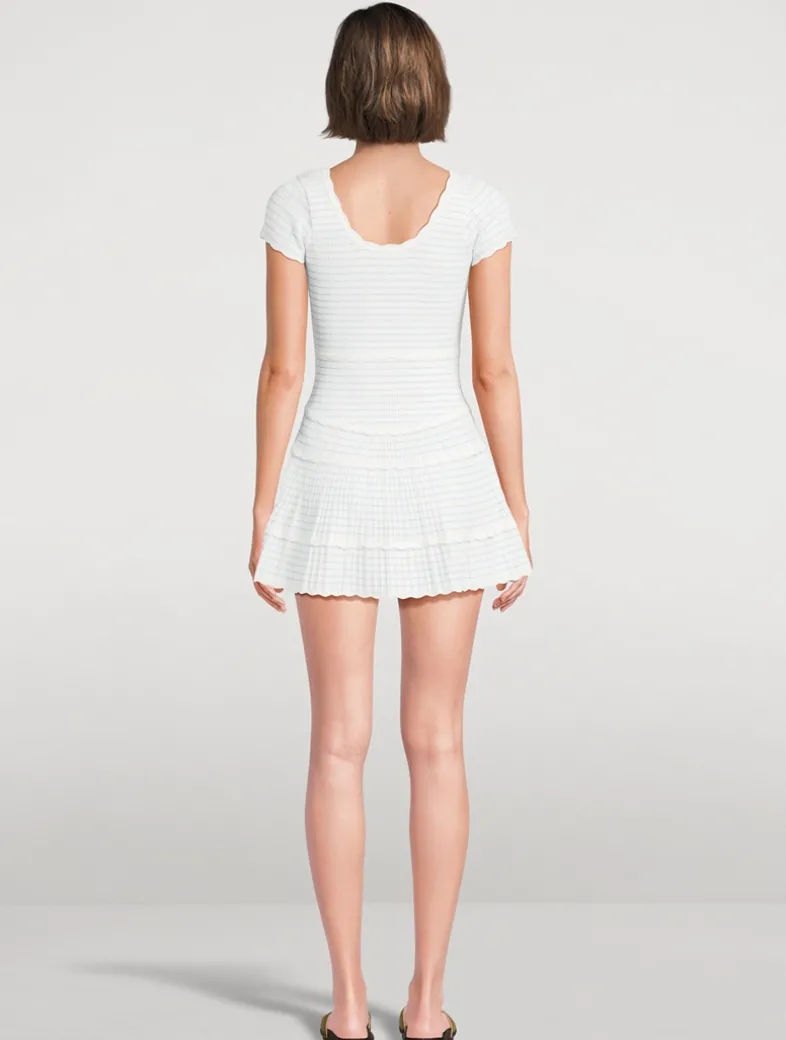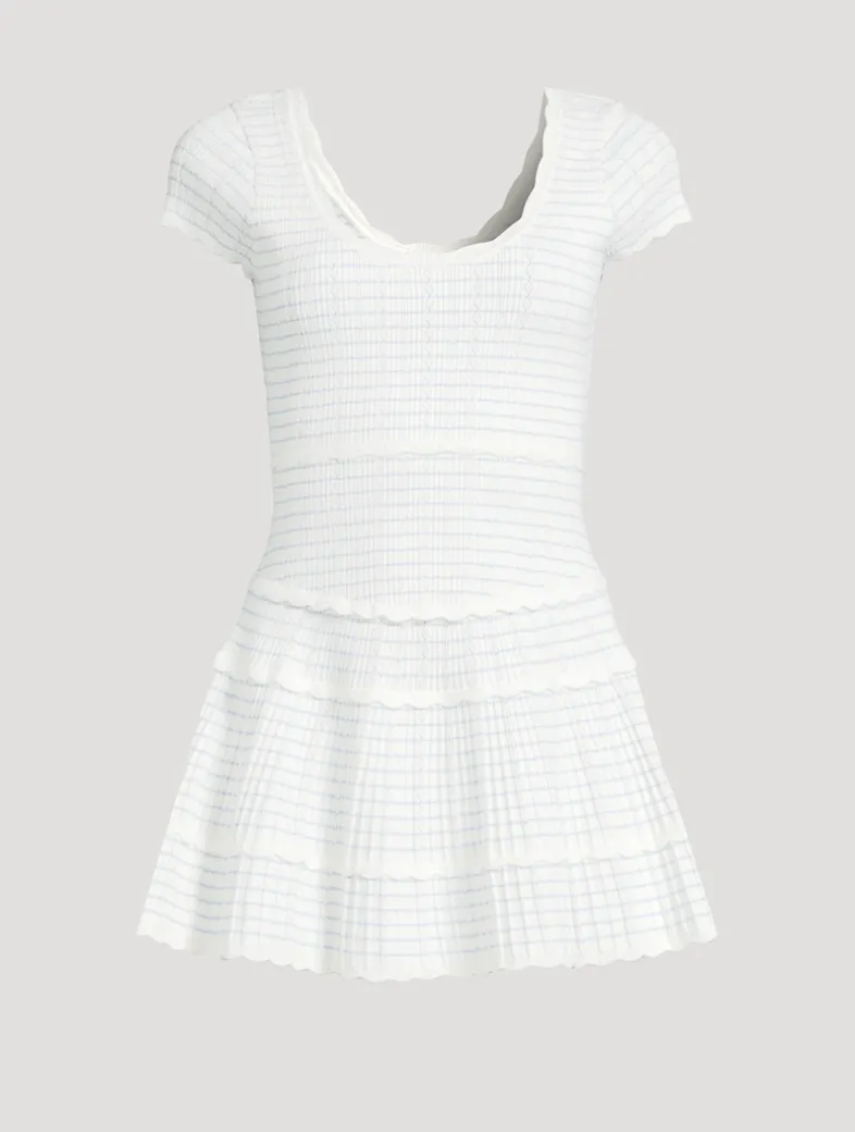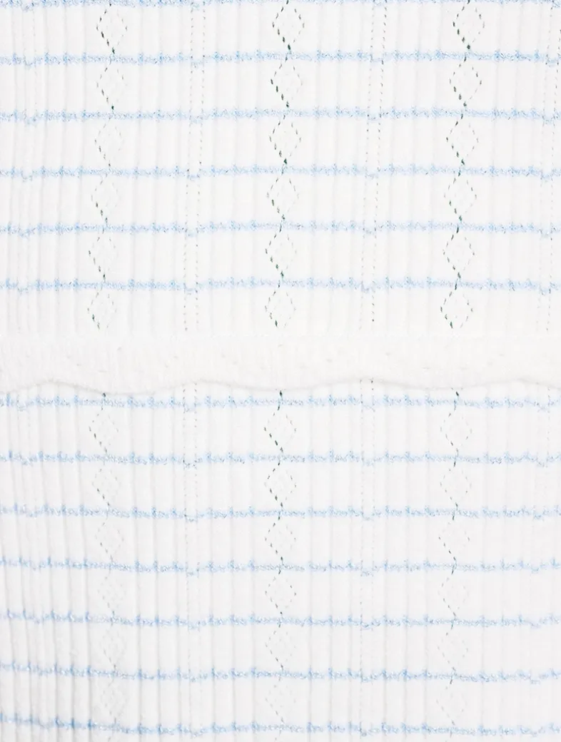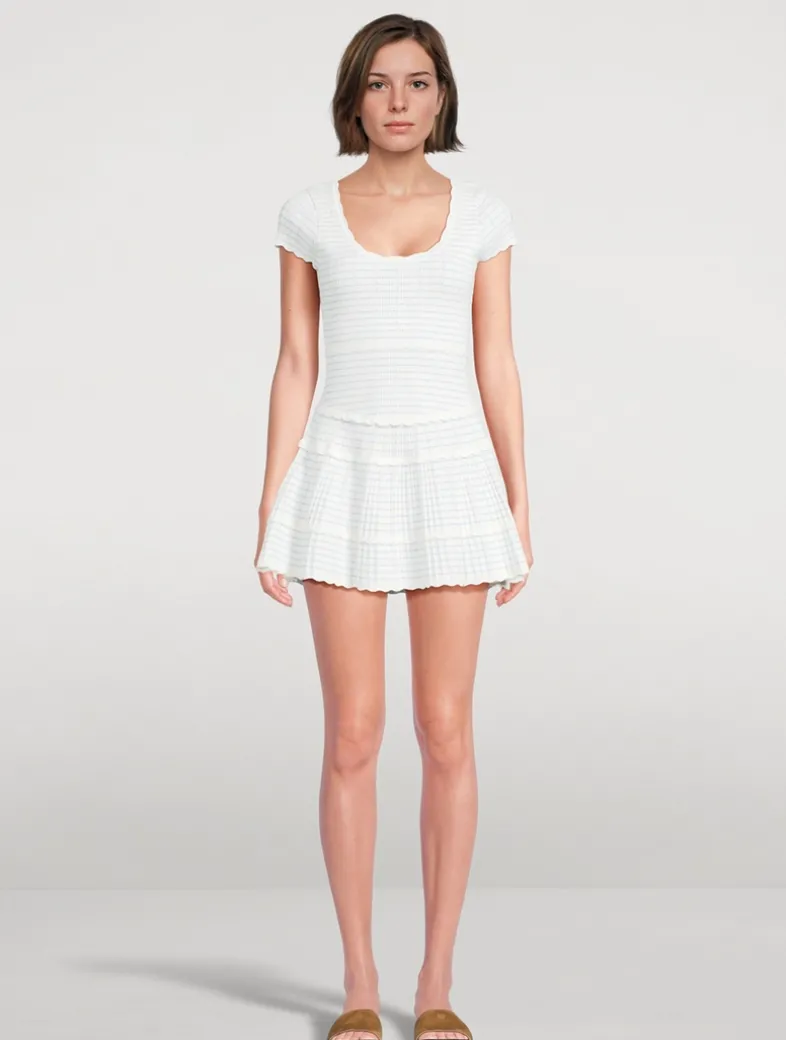 This charming mini dress is made from the brand’s pointelle yarn, offering stretch and an extra-soft feel, with stripes throughout in lurex that give the piece signature LoveShackFancy shimmer. Featuring short cap sleeves, a scoop neckline, scallop details, and a fit-and-flare silhouette, the dress is both playful and elegant.