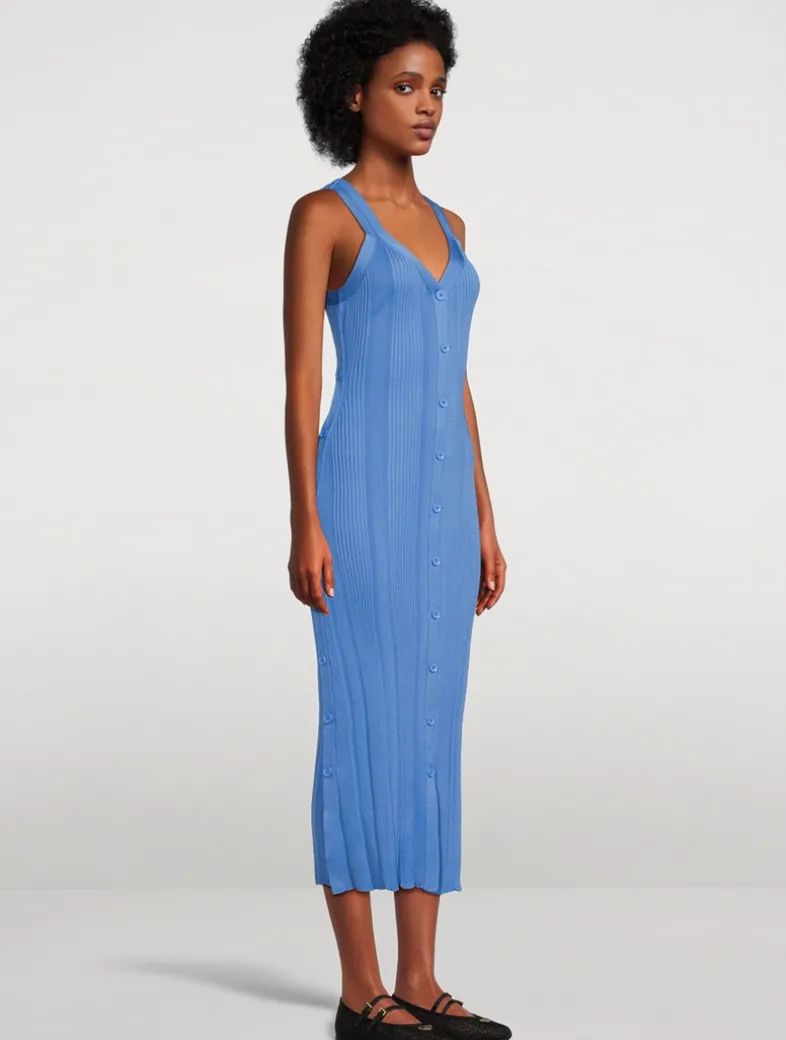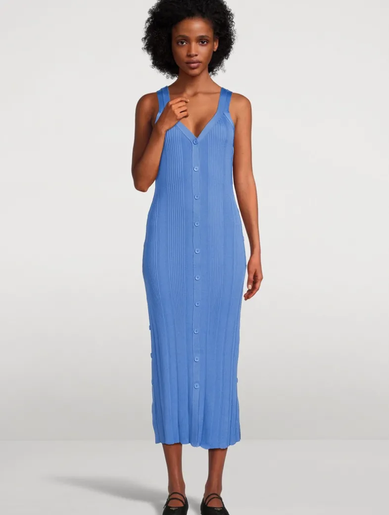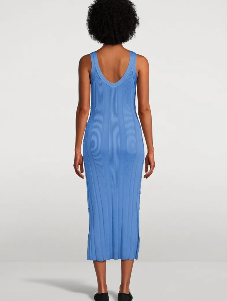 Cut to a curve-hugging silhouette, the Ellis Dress is crafted from a lightweight knit textured with a column rib framed by smooth trim. It is accented with buttoned detailing along the center front and sides, allowing it to be adjusted to reveal a hint of skin.