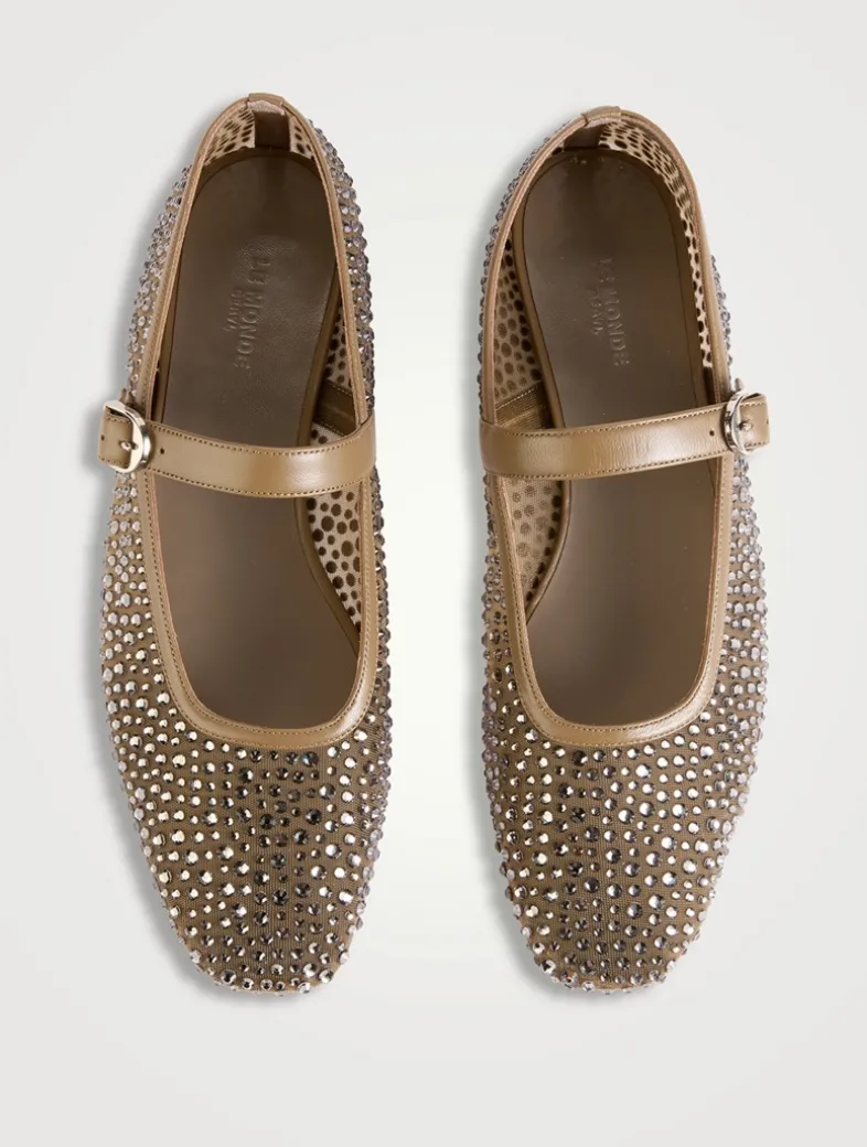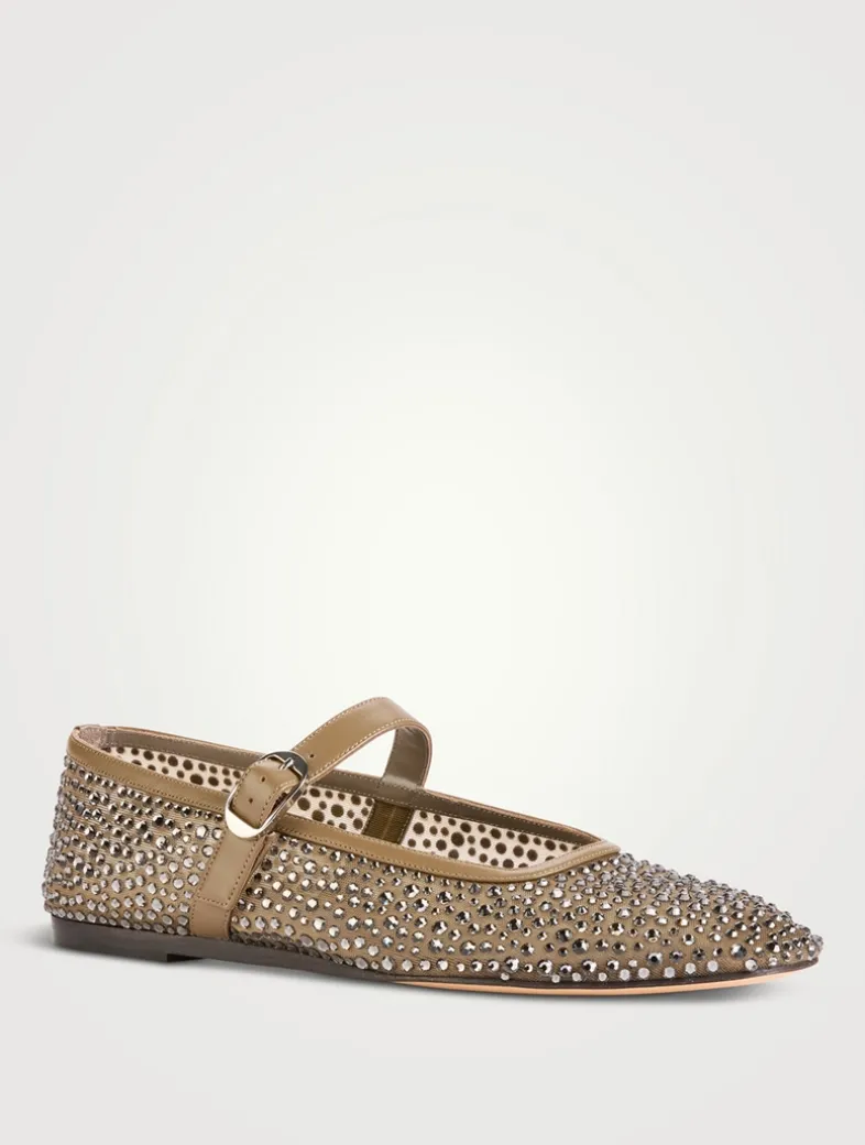 A delicate mesh construction punctuated with sparkling crystals defines these flats. The ballerinas have a rounded square toe and a leather Mary Jane-style strap with a buckled closure.