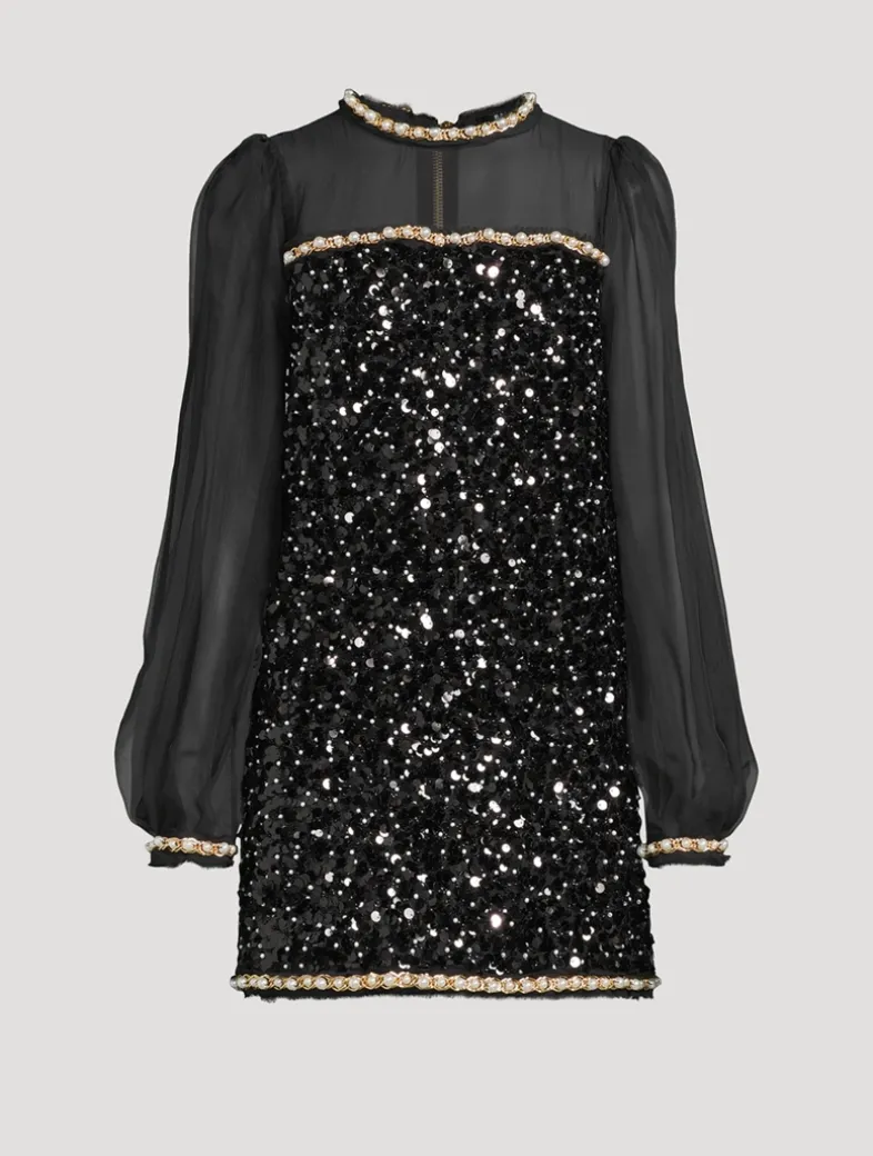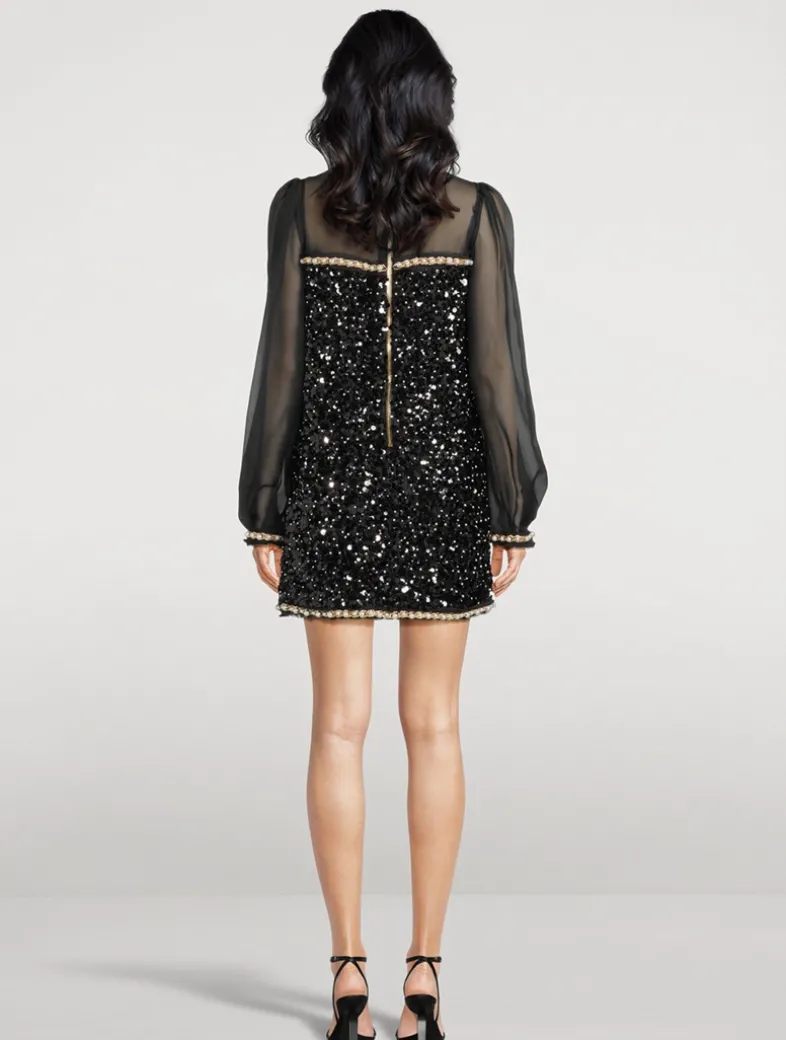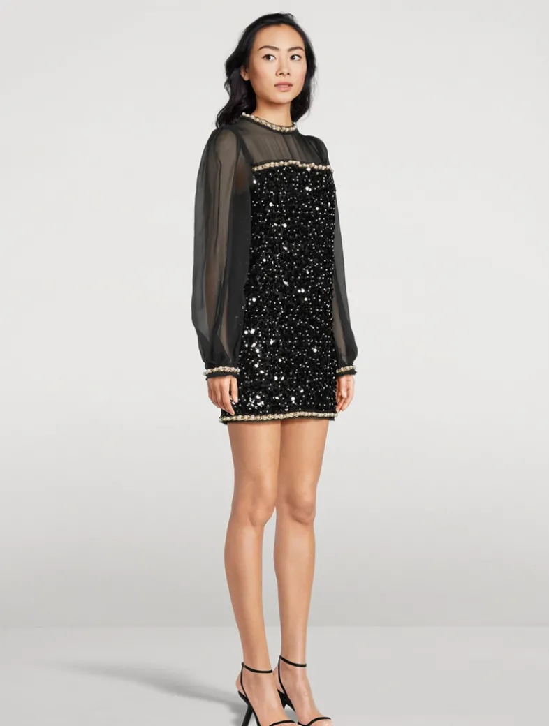 This exquisite mini dress has a mixed-media design and the perfect amount of sparkle for evening. It has a semi-sheer chiffon yoke and long puffed sleeves, while the crêpe body has a shift silhouette embellished with shimmering sequins. Beaded chain embroidery adds a signature Balmain touch.