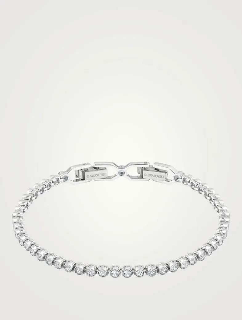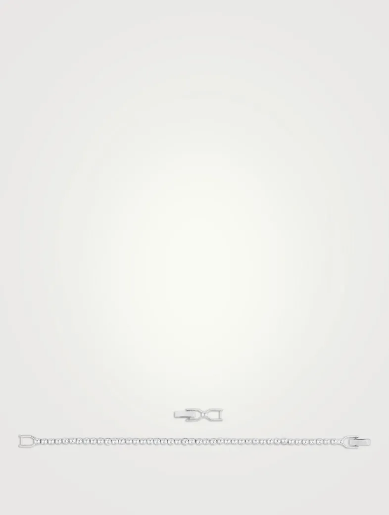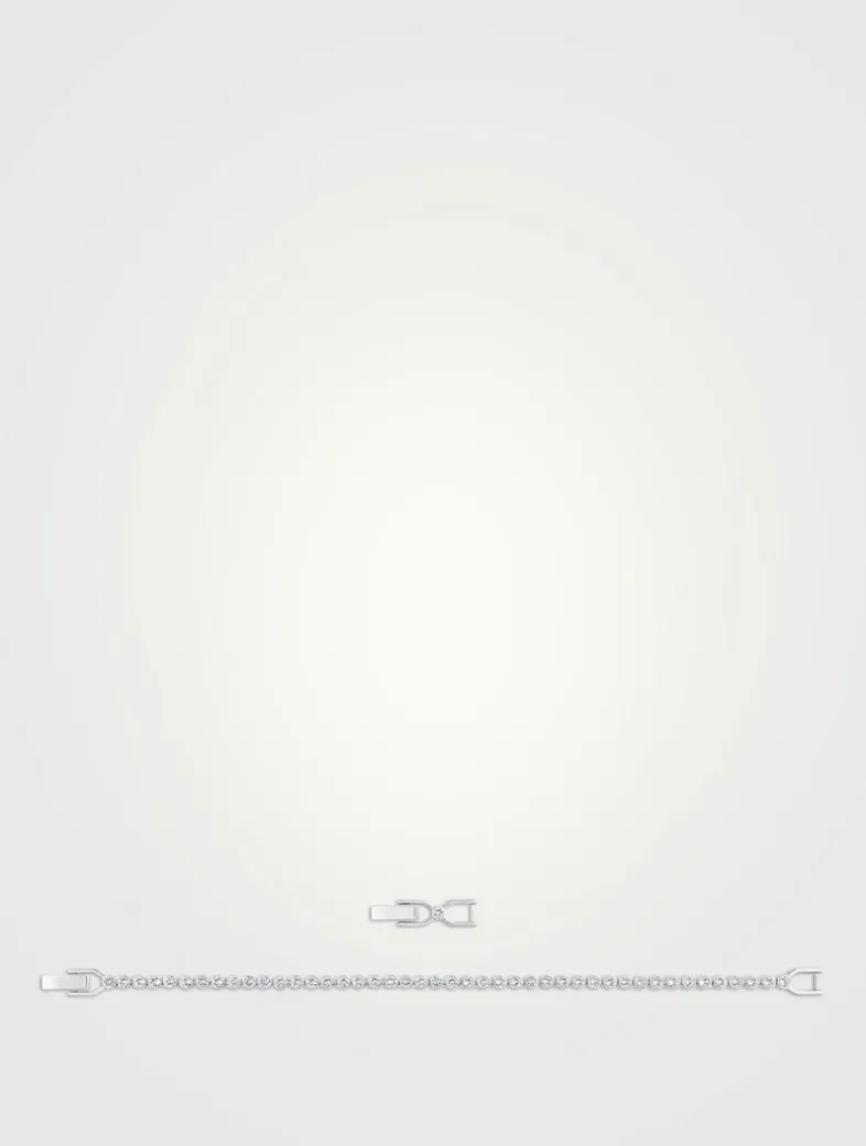 This delicate strand of bezel-set clear crystals on a rhodium-plated bracelet is very dainty and minimalistic yet makes a bold statement of sheer elegance. It has a secure foldover clasp closure and comes with an extender.