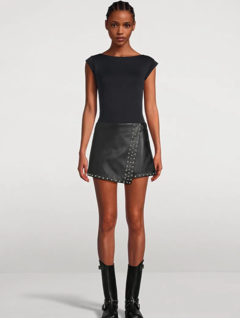 This low-rise faux leather coated skort is embellished with metal studs and designed with a wrapped silhouette.