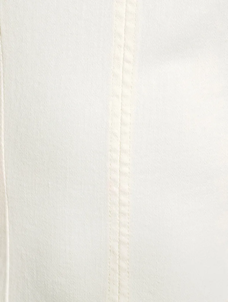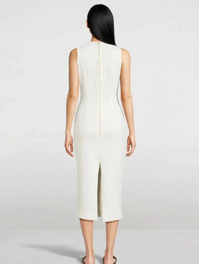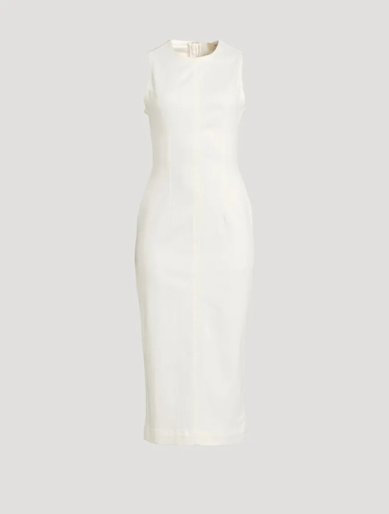 Esme is a form-fitting, sleeveless midi dress closed with a zipper at the back. Crafted from denim with a hint of stretch.