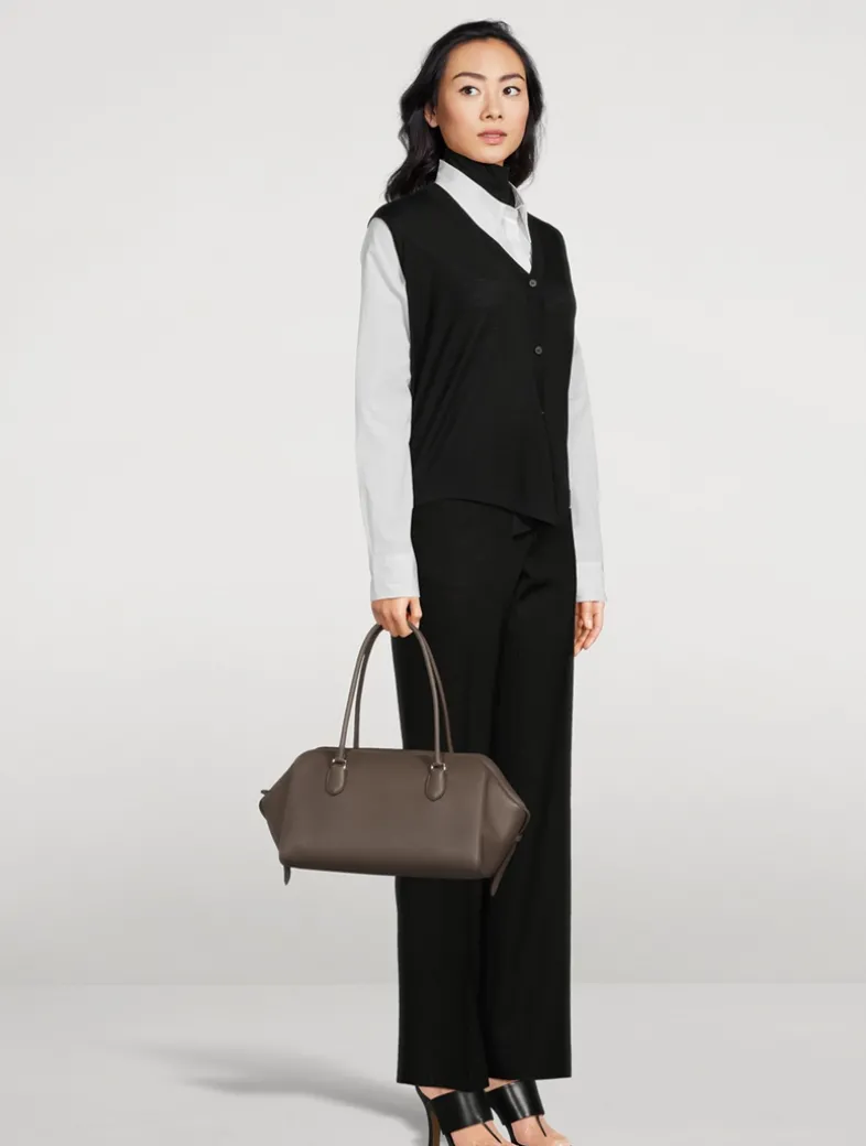 Structured bowling bag in grained calfskin leather with architectural gussets, tubular handles, and zip-top closure.