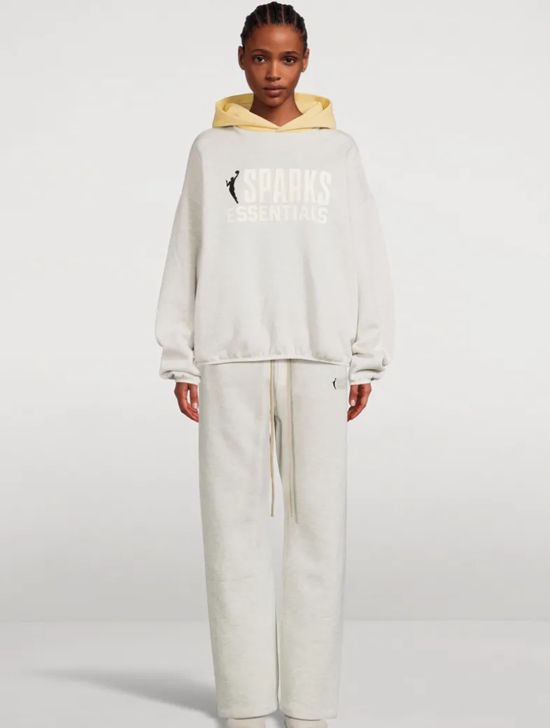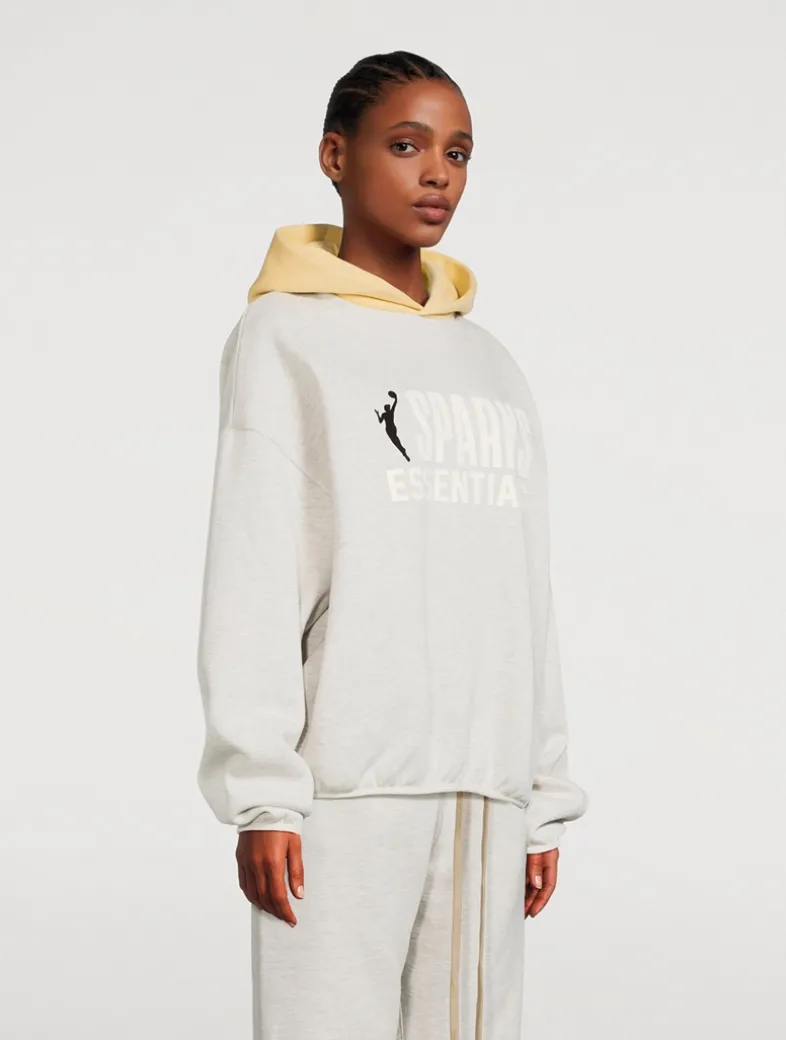 Part of the collaboration between Fear of God Essentials and the NBA/WNBA, this hooded sweatshirt is constructed from core fleece and boasts a voluminous, cropped silhouette. Detailed with a contrasting double-layered hood, side seam pockets, and elastic bindings at the cuffs and waist hem, the pullover style features a rubberized soft-touch WNBA logo alongside the