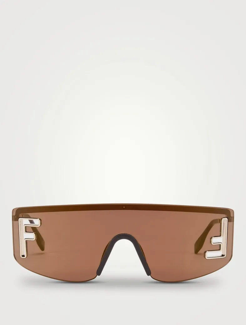 This wraparound mask style has a straight top and curved design, featuring oversized cut out FF logo details.