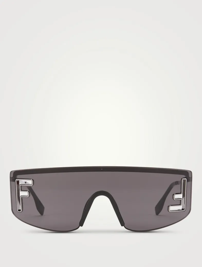 This wraparound mask style has a straight top and curved design, featuring oversized cut out FF logo details.