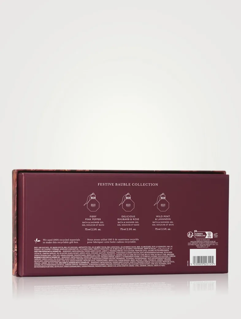 A vibrant trio of Molton Brown’s most popular woody, fruity, and aromatic shower gels in a jewel-inspired design. Slip these scented ornaments into their stocking, hang on the tree for extra sparkle, or add as a refined place setting.