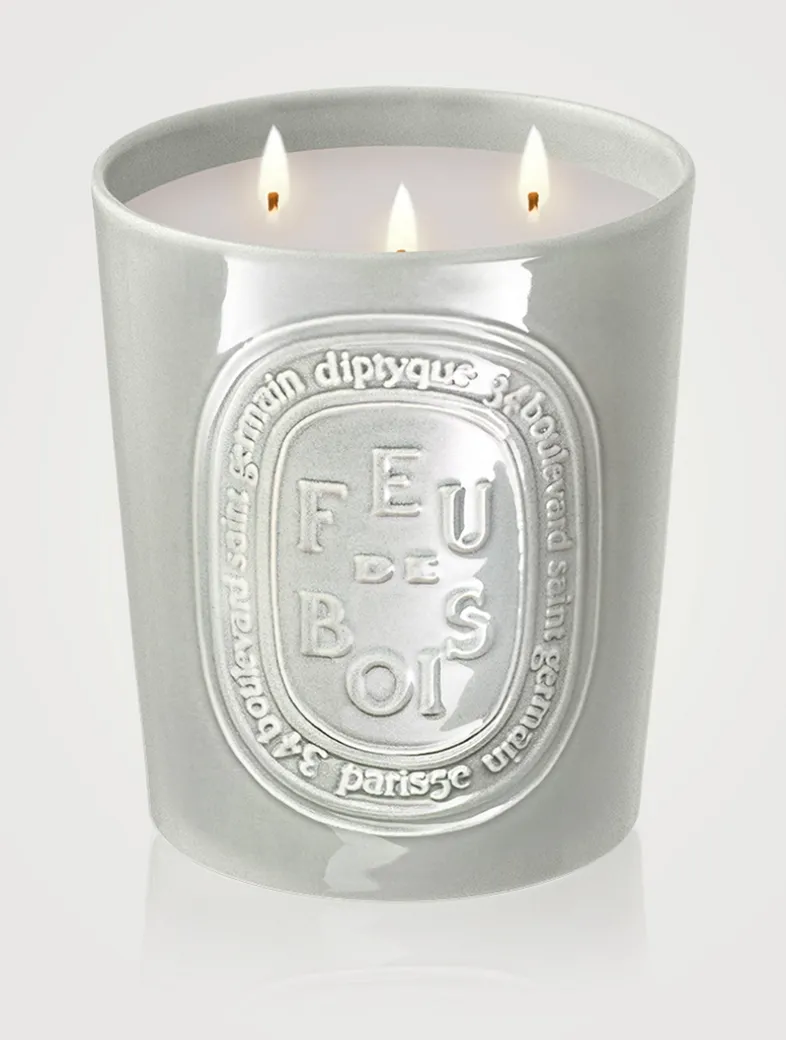 This Feu de Bois (Wood Fire) candle comes in a grey enamelled porcelain jar stamped with the diptyque oval. the iconic scent evokes the smell of an open fire in the hearth: the wood crackles as flames slowly consume the logs, releasing their dense, smoky scent.
