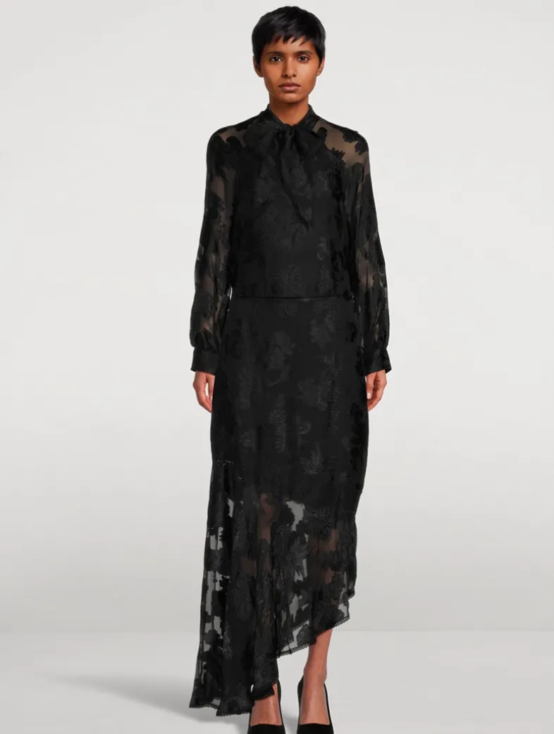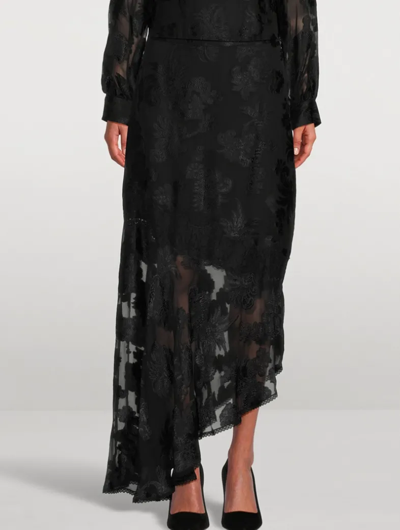 Exuding a sense of dark romanticism, this asymmetric maxi skirt is crafted in fil coupé chiffon with floral lace detailing. This model features scalloped trim-finished hems.