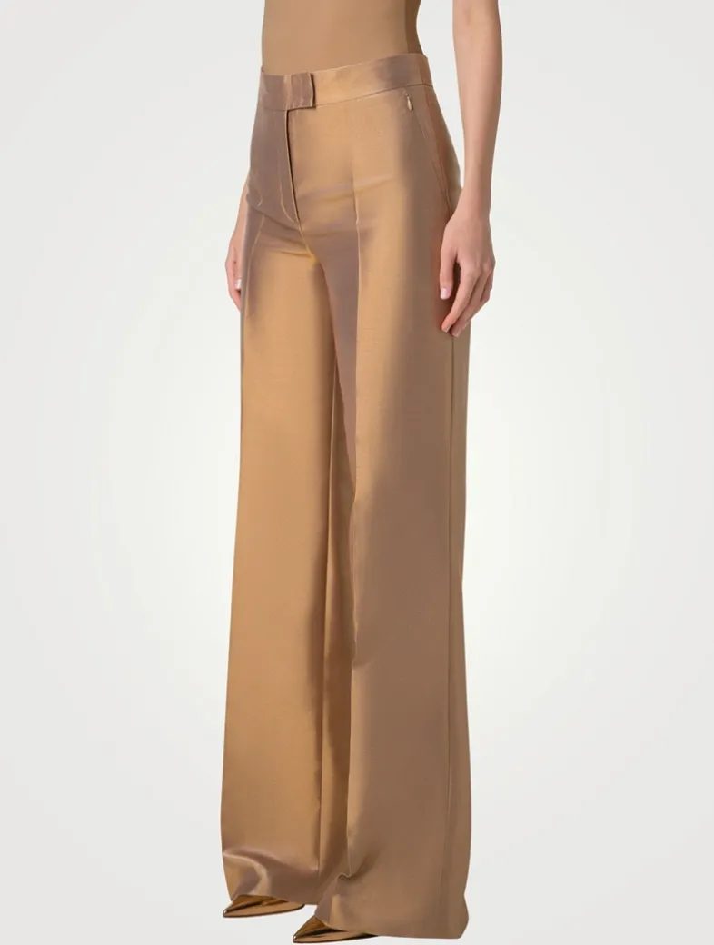 Crafted from a luxurious silk blend in a metallic satin finish, these high-waisted pants are designed with a straight, wide-leg silhouette that flatters from front to back. Complete with side pockets and a concealed front closure, the pair boasts a gleaming metallic finish that elevates the piece.
