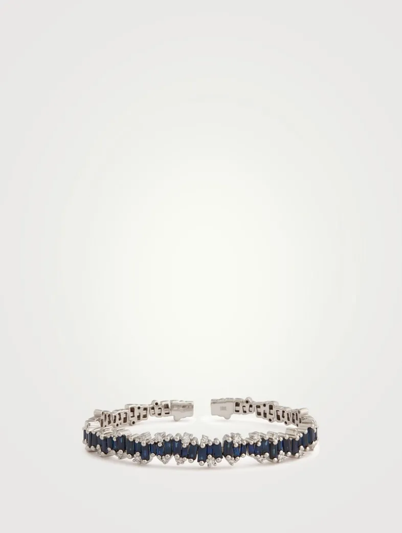 This flexible cuff bracelet is set with baguette-cut dark blue sapphire on the signature SUZANNE KALAN fireworks setting.
