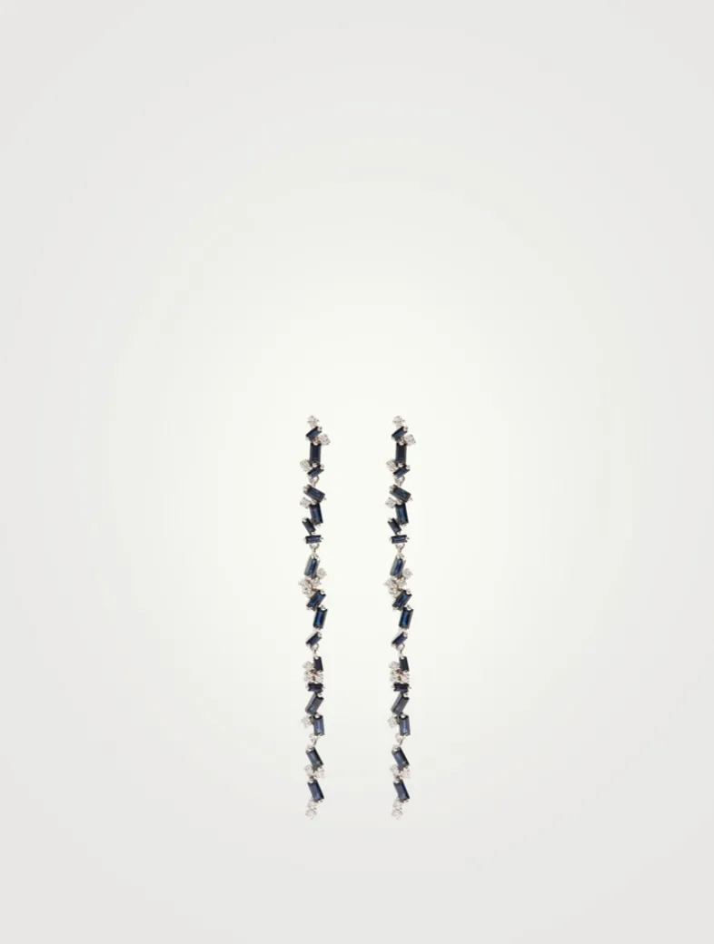 Dangling drop earrings accented with baguette-cut sapphires and round-cut diamonds.
