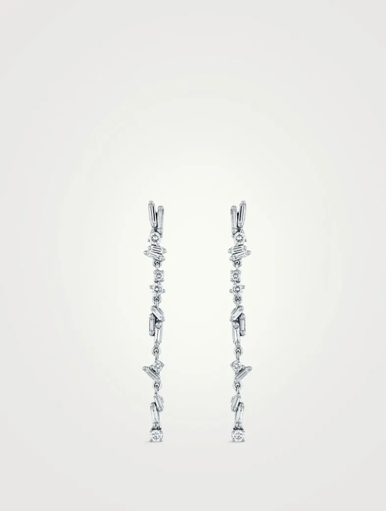 Dangling drop earrings with baguette and round-cut diamonds in signature fireworks settings.