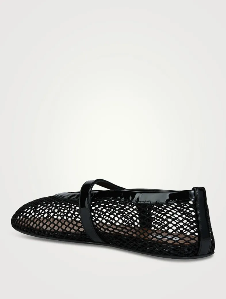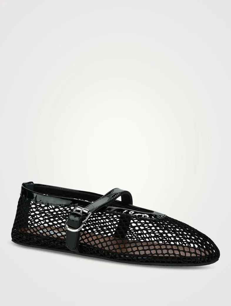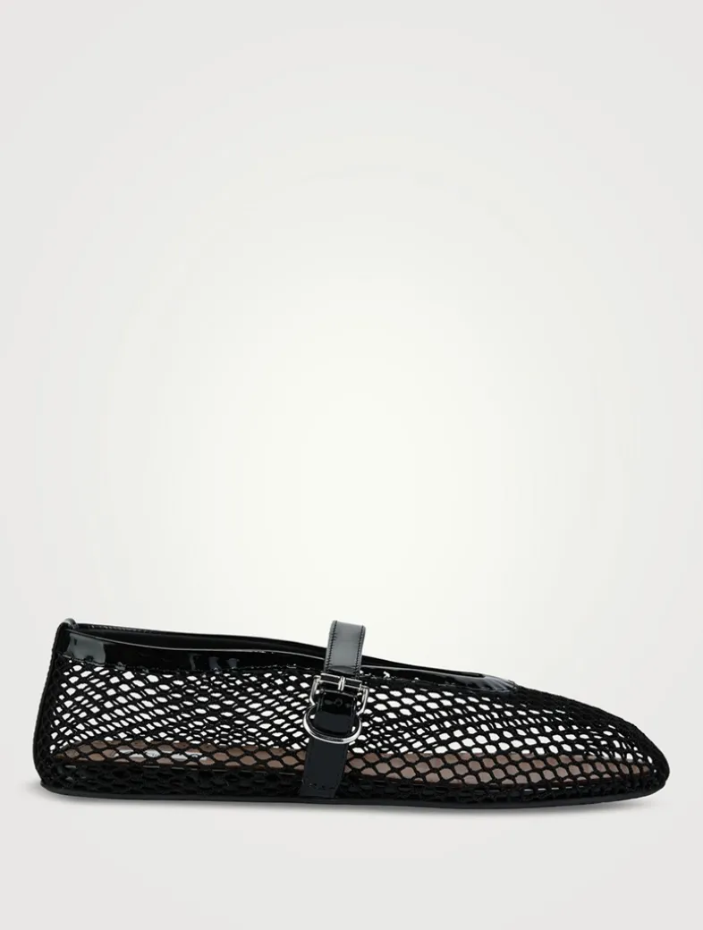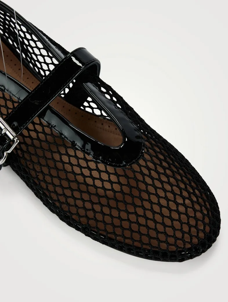 Edged with glossy patent leather, these flats are crafted of a delicate mesh netting. This pair is detailed with a rounded toe and an adjustable Mary Jane strap across the top of the foot.