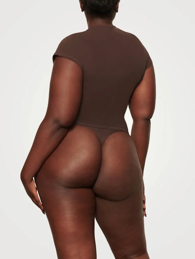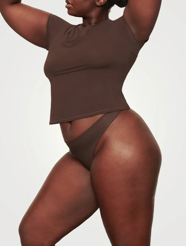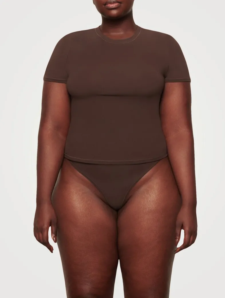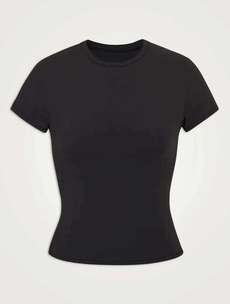 SKIMS has perfected the T-shirt. Made with their signature buttery-soft fabric with incredible stretch and a second-skin feel, this versatile tee molds to your body for the most flattering fit whether you’re dressing it up or down. Features a classic crew neckline and short sleeves. Fits true to size.