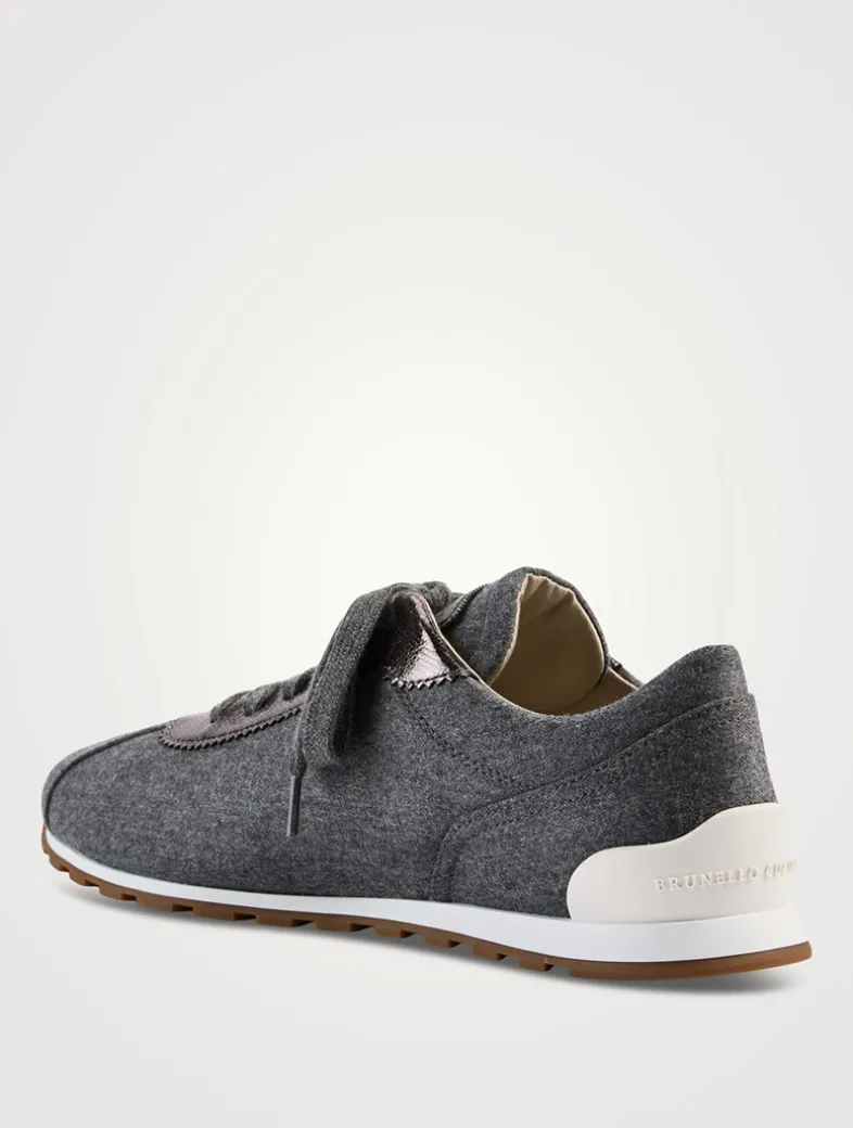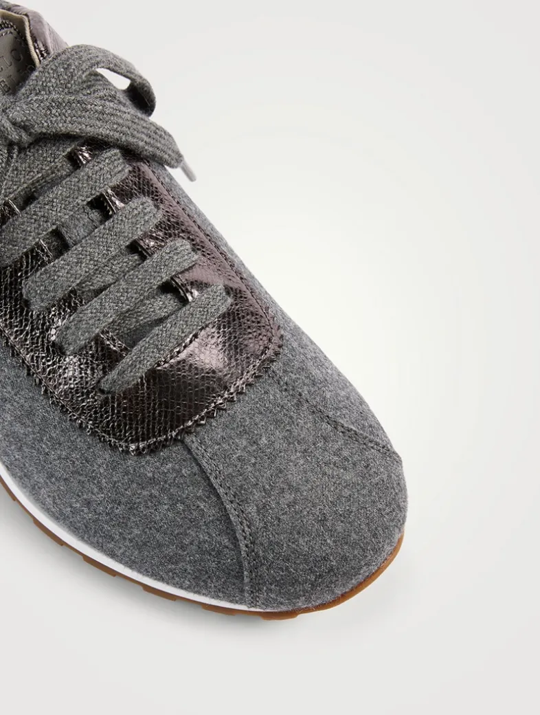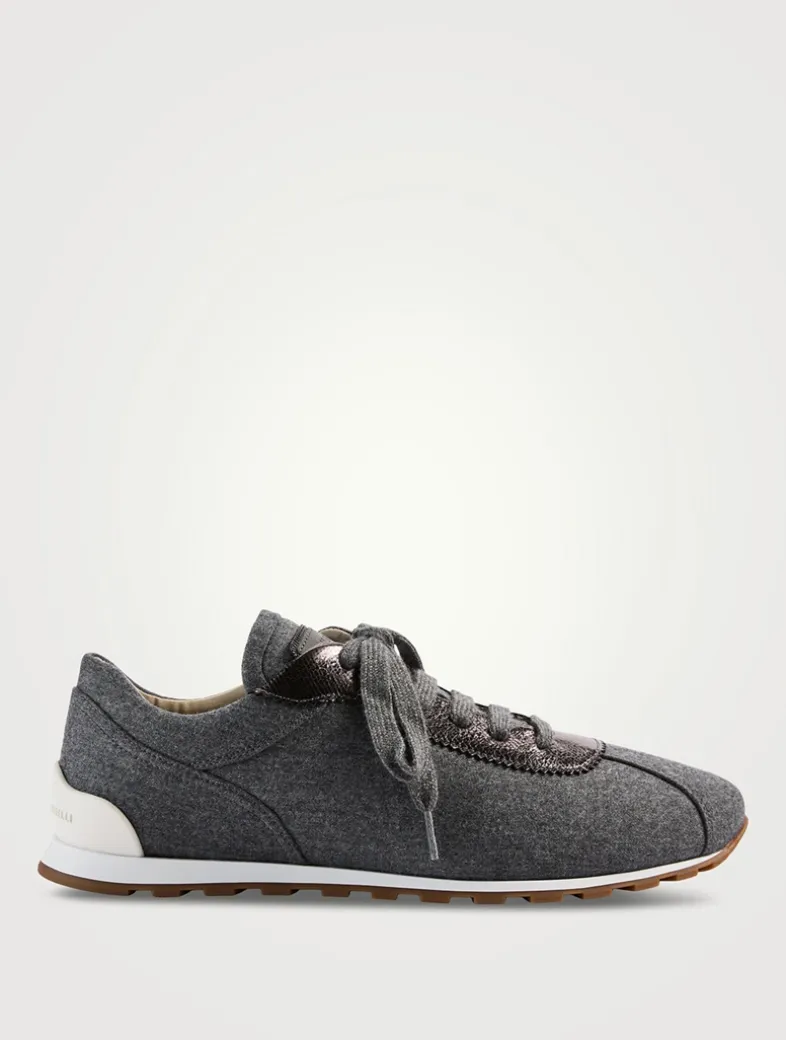 A luxe take on a sporty style, these low-top sneakers are crafted from flannel trimmed with metallic leather.
