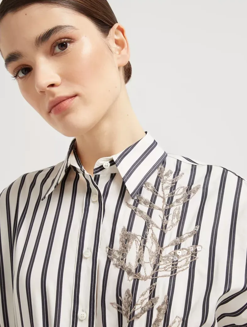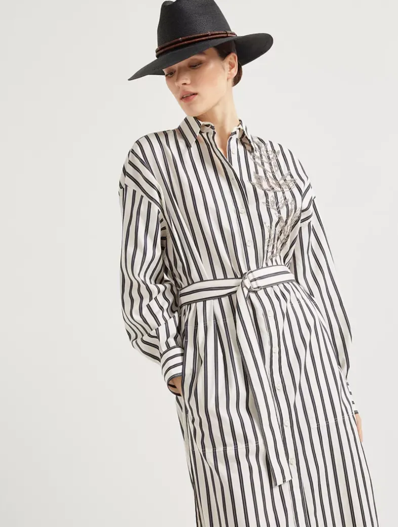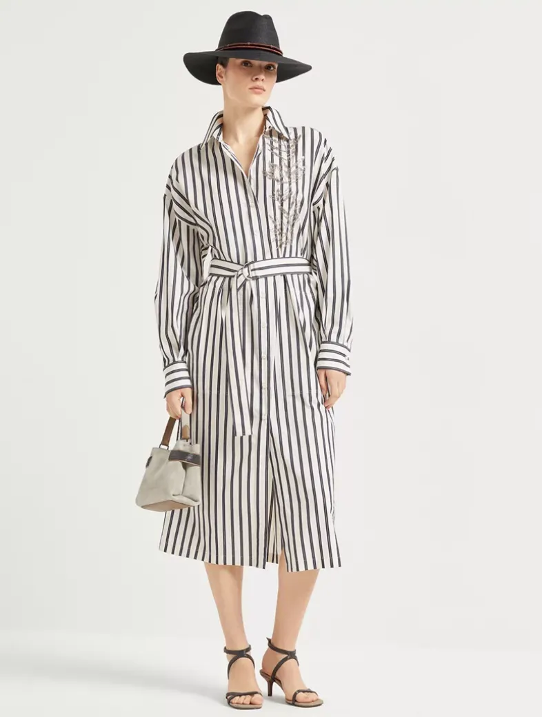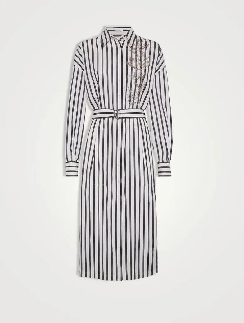 Regimental cotton and silk poplin belted shirt dress with glistening flora embroidery