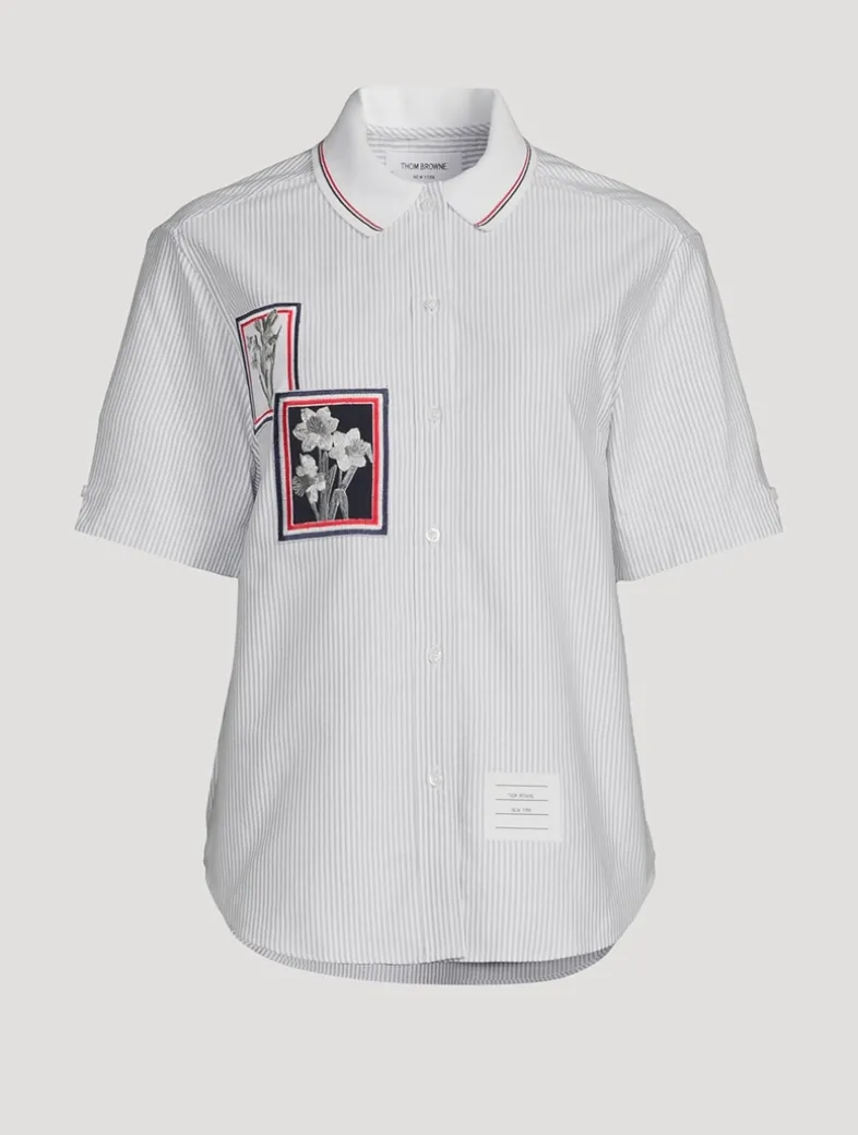 A pair of floral-embroidered patches highlights the chest of this tailored shirt. Crafted from crisp cotton poplin, it is printed with subtle pinstripes and topped with a stripe-trimmed collar. Short sleeves with split cuffs completes the look.