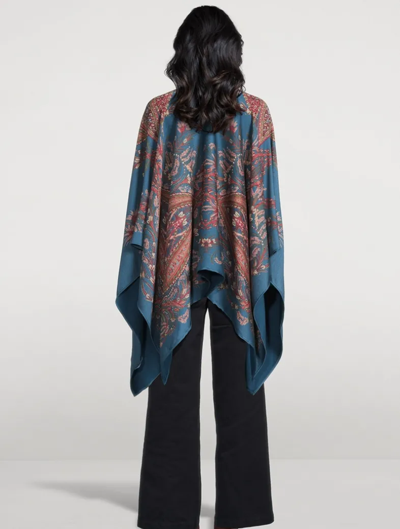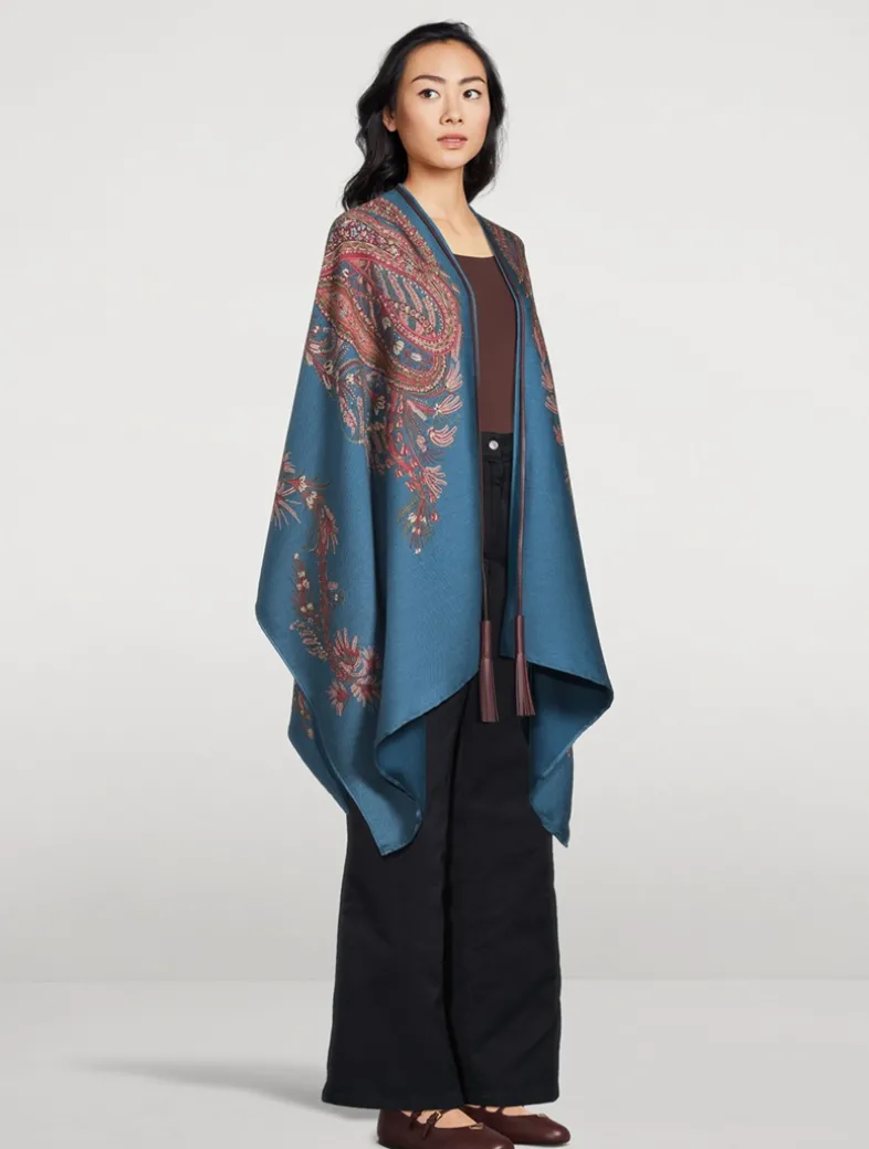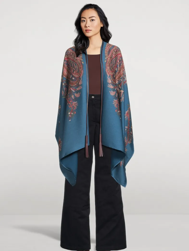 This cape is made from wool-blend twill with distinctive, placed floral Paisley motif. It features a lace closure with two tassels at the bottom.