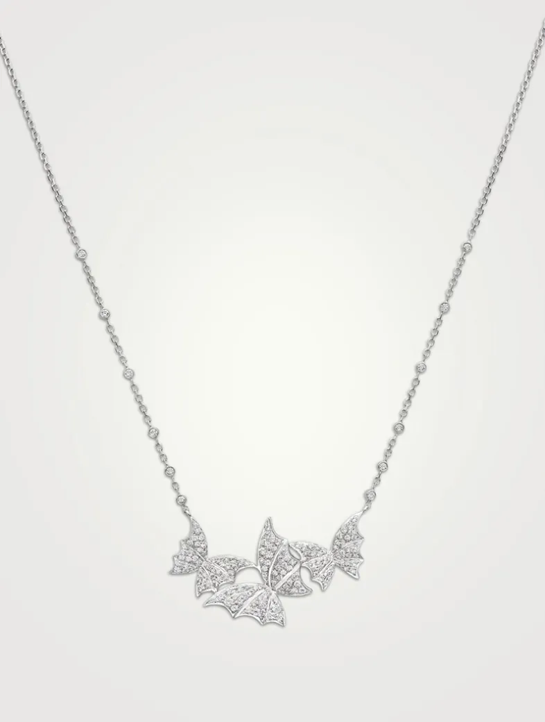 From the Fly By Night collection and inspired by creatures of the darkest forest depths, this intricately handcrafted necklace is crafted from 18k white gold, and features a pendant set with white pavé diamonds.