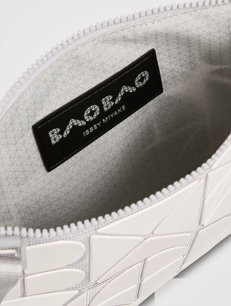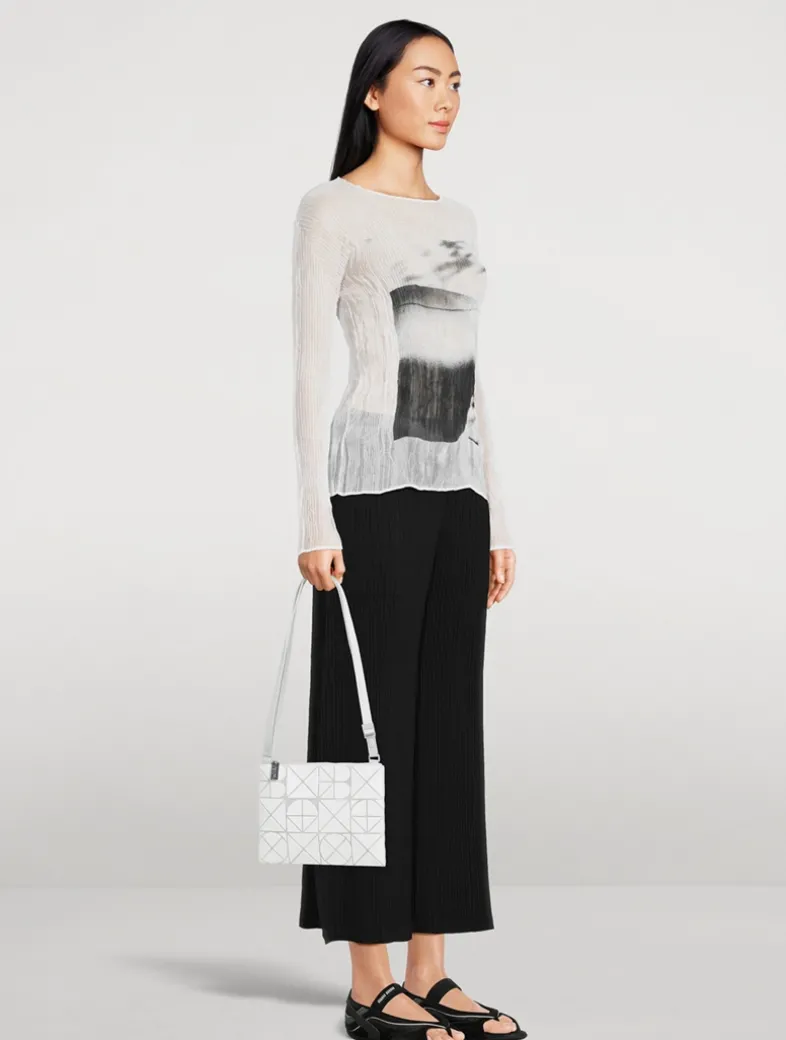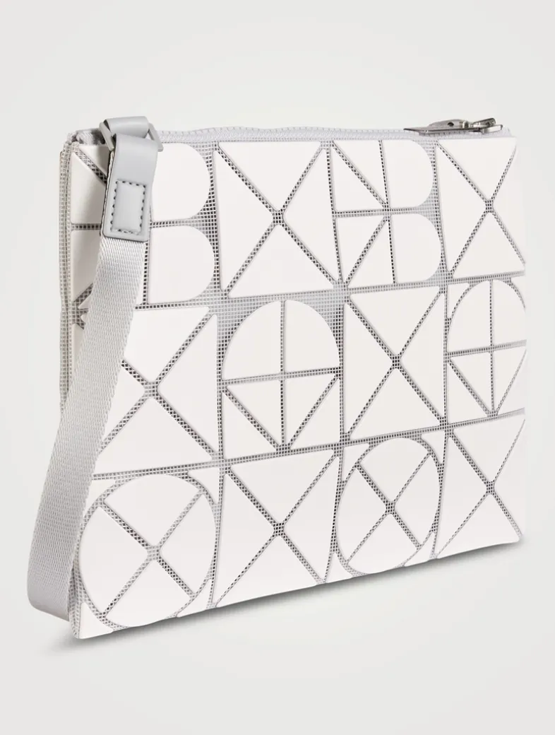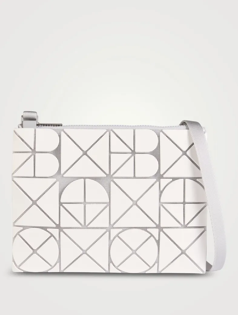 This shoulder bag partially uses deformed pieces that form the brand name