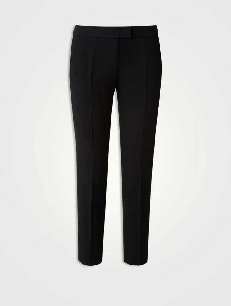Ankle-length jersey pants in techno stretch fabric with slash pockets at the sides, faux back pockets and front zippered closure.