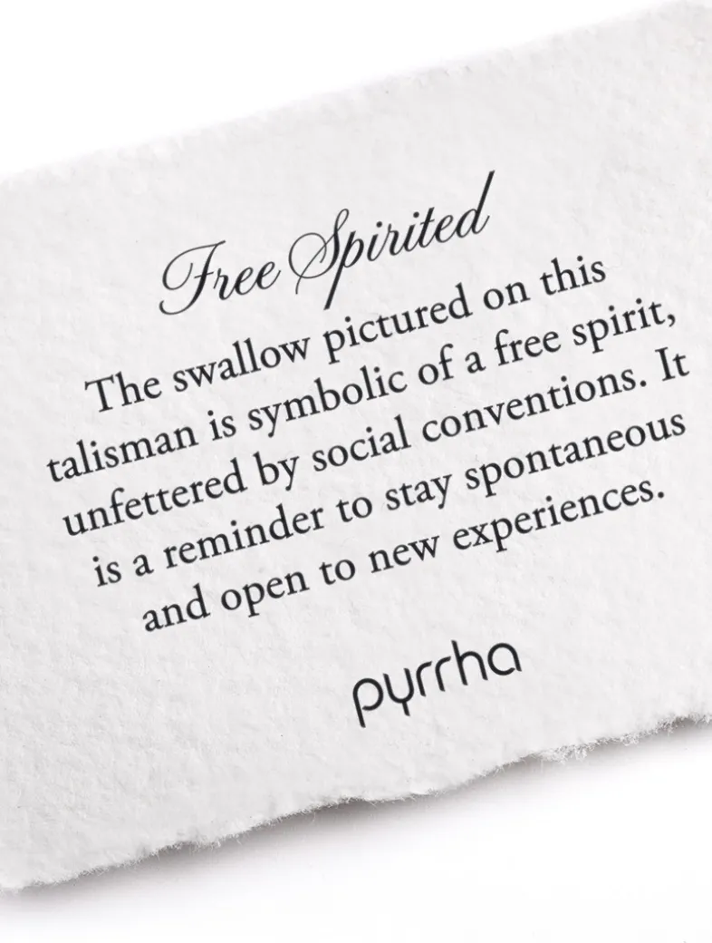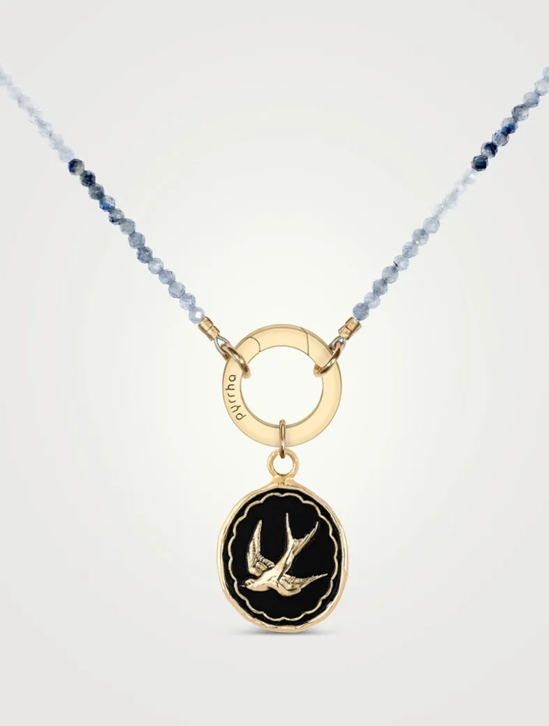 This talisman is suspended on a variegated teal sapphire rondelle beaded choker and secured with an elegant talisman clip. The swallow symbolizes a free spirit, unbound by convention and open to new experiences, while sapphire represents loyalty. Handcrafted in Vancouver, Canada and cast in 100% recycled 14k gold.