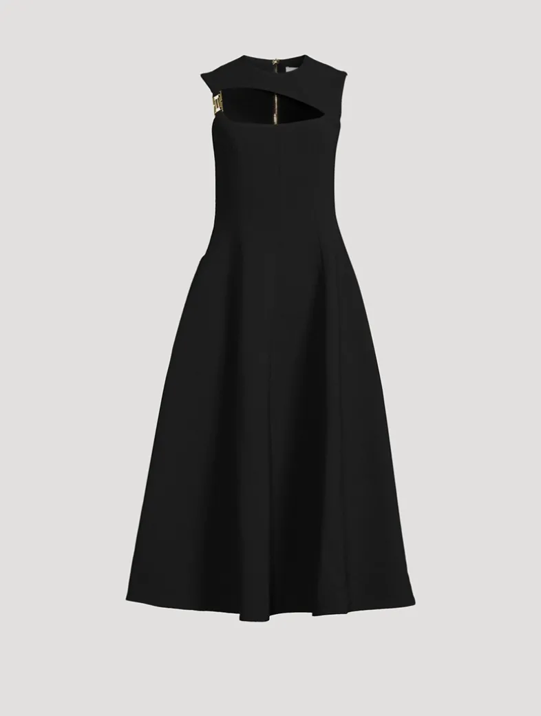 An asymmetric cut-out at the bust of this cocktail dress is embellished with metal hardware, to reveal a hint of skin and nod to Deco-inspired styles.
