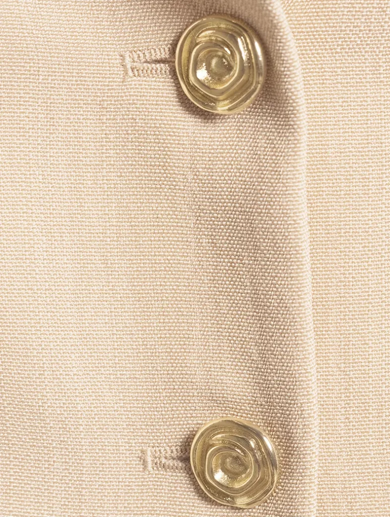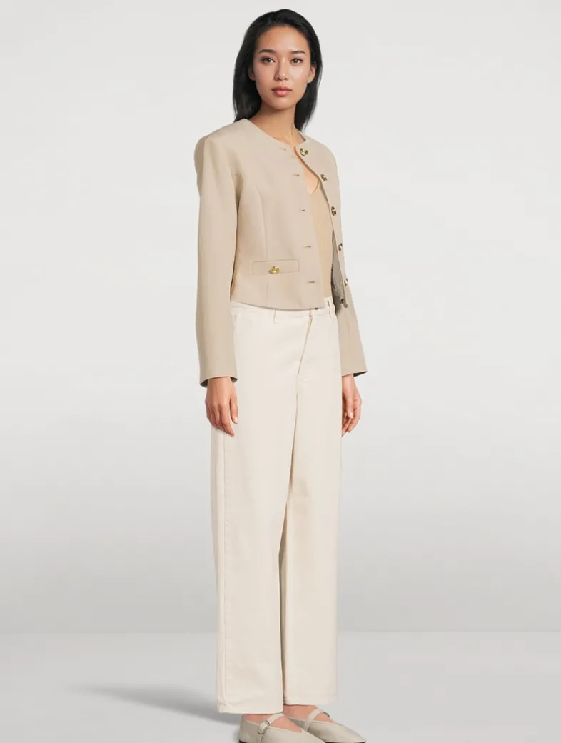 The tailored Frida blazer, with its gold-tone buttons, round collarless neckline, and small front pockets, this single-breasted design is inspired by classic ladylike jackets.