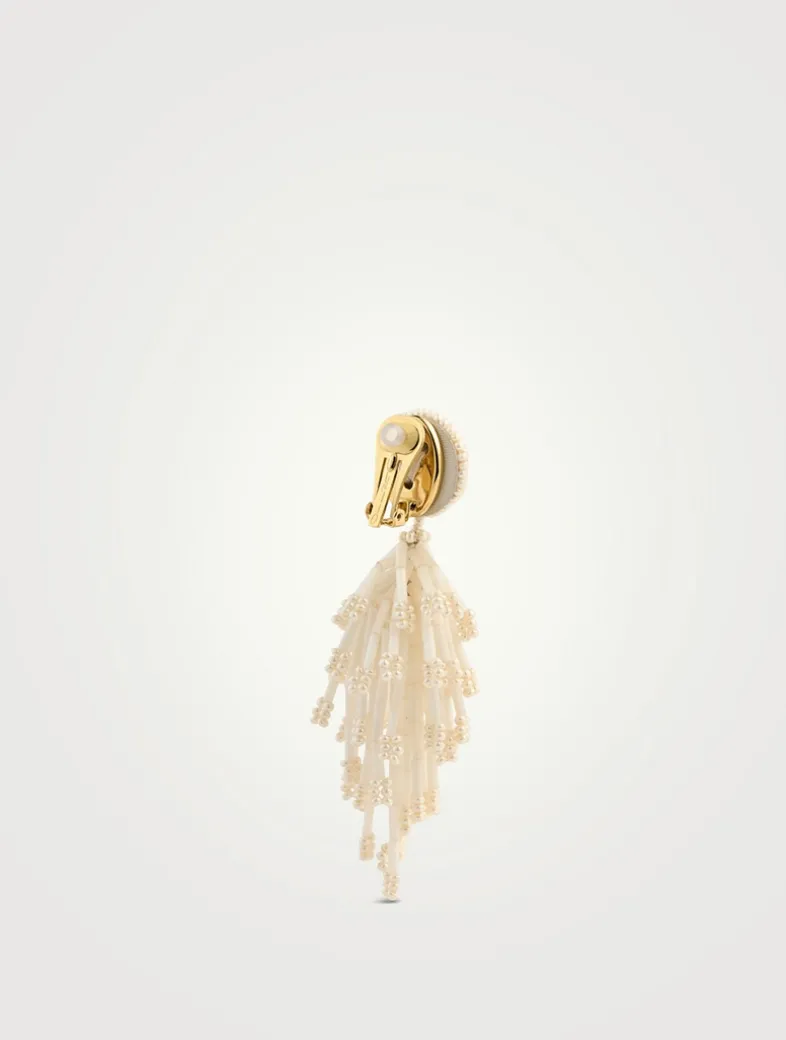 Fringed strands hang from a matching fastening, draping with simple elegance. The cascading beads create fluid movement, adding depth and contrast to the design.