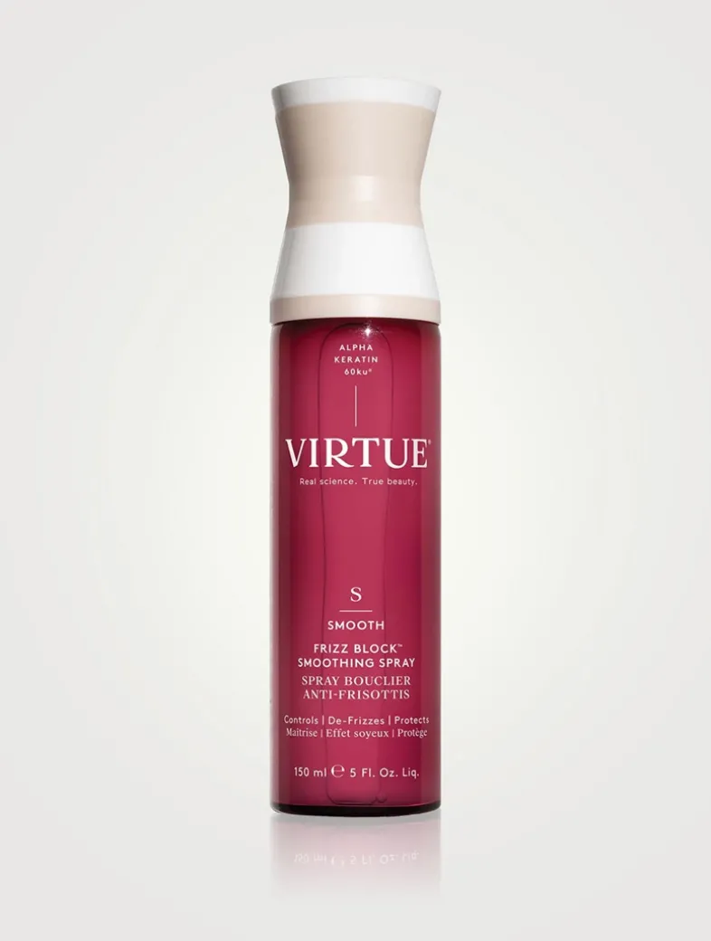 A lightweight, milky microemulsion mist. Controls, De-Frizzes, Protects. A weightless, humidity-halting spray with ingredients that help protect hair from UV damage and stop frizz in its tracks for 72 hours of heat-safe, silky-smooth strands. Frizz Block Smoothing Spray creates an impenetrable veil of humidity-blocking, frizz-stopping, moisture-locking mist that protects strands for 72 hours. Created for harsh humid conditions, this alcohol-free, heat-activated spray is the prescription-strength equivalent of traditional anti-frizz sprays. Virtue’s proprietary Alpha Keratin 60ku® instantly fills and seals cracked cuticles while featherweight polymers and lipids hover above, repelling air-born humidity. This lightweight, milky mist is alcohol free, so it won’t create build-up or dry out hair, and it’s heat protective up to 450 degrees, leaving hair healthy, silky-soft, and free of frizz for days.