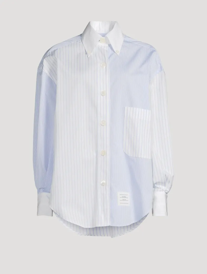 Inspired by preppy American country life, this voluminous poplin shirt features contrasting stripes stitched together in a patchwork form. Underneath the cuff lies the brand’s signature grosgrain trim, adding a touch of understated luxury.