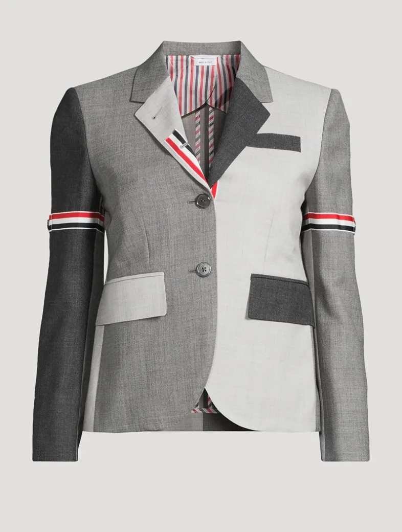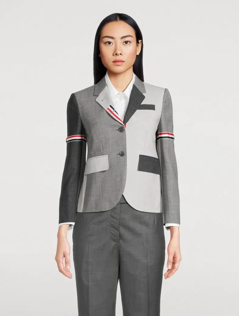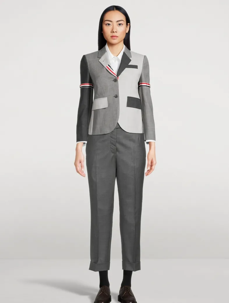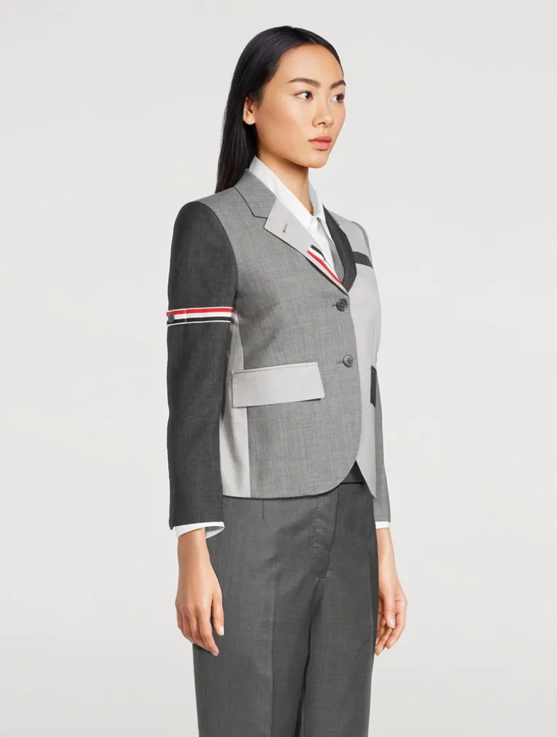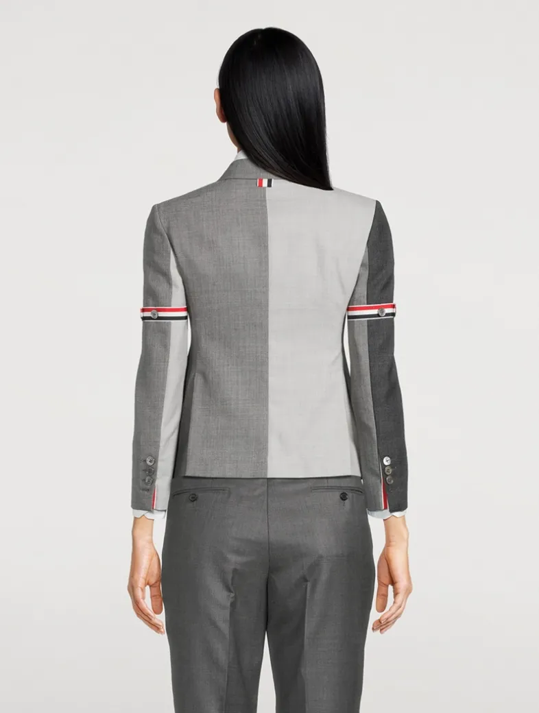 This classic jacket is crafted of a tonal mix of wool panels with grosgrain striped trim, lending a subtle modernity to this piece. It is tailored in a menswear-inspired silhouette with a single-breasted closure and flap pockets at the waist.