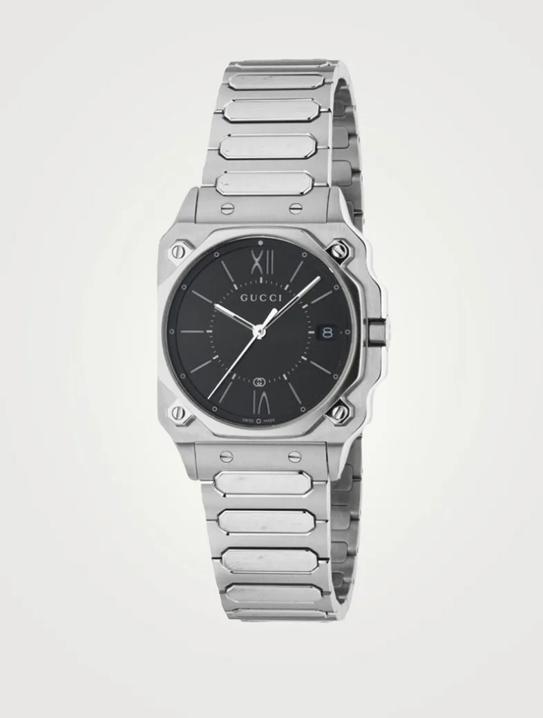 Featuring a sleek flat case shape, this stainless steel bracelet watch is distinguished by a date window at 3 o’clock and bold black dial.