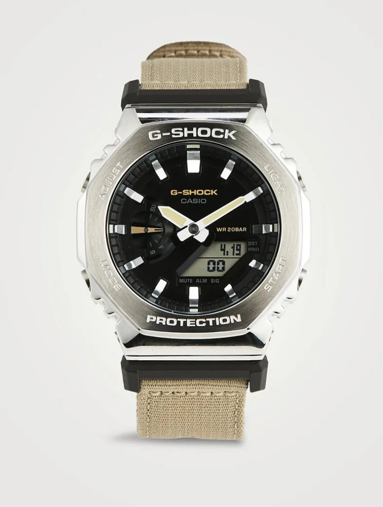 From the Utility Metal collection, this innovative watch takes the iconic octagonal form and metal-clad design of the GM-2100 line and pairs it with a casual fabric band in a utilitarian colour.